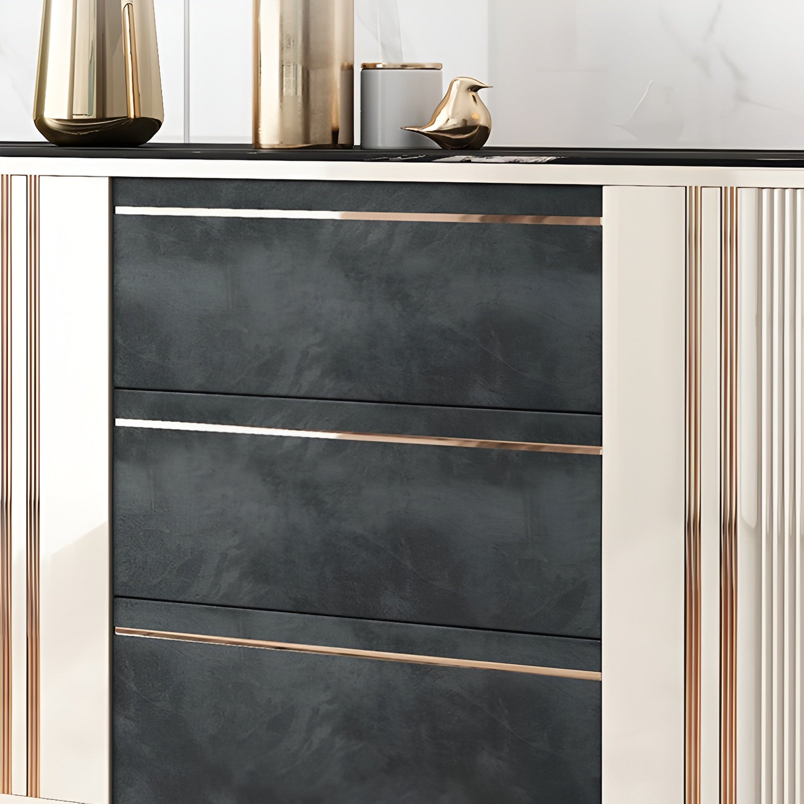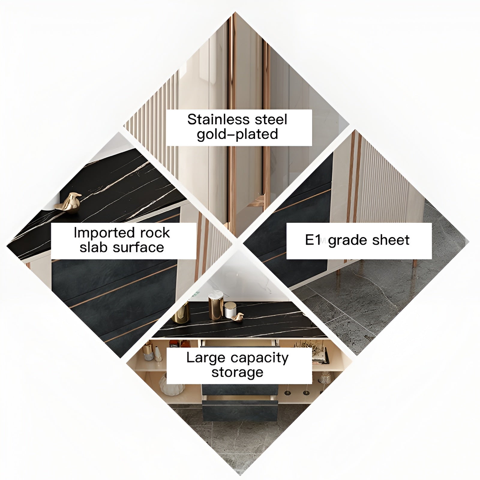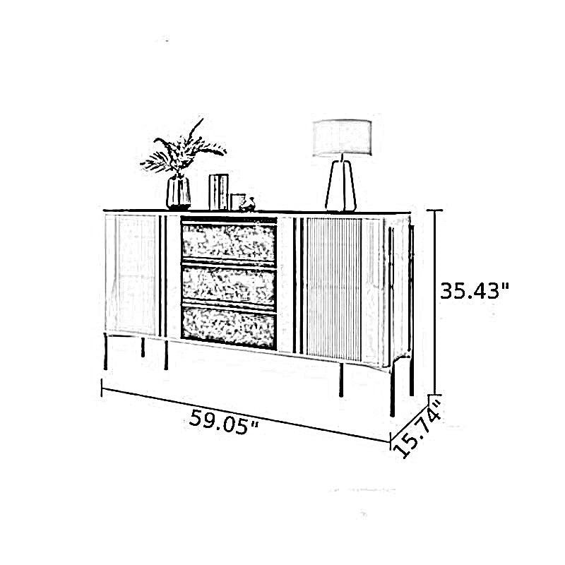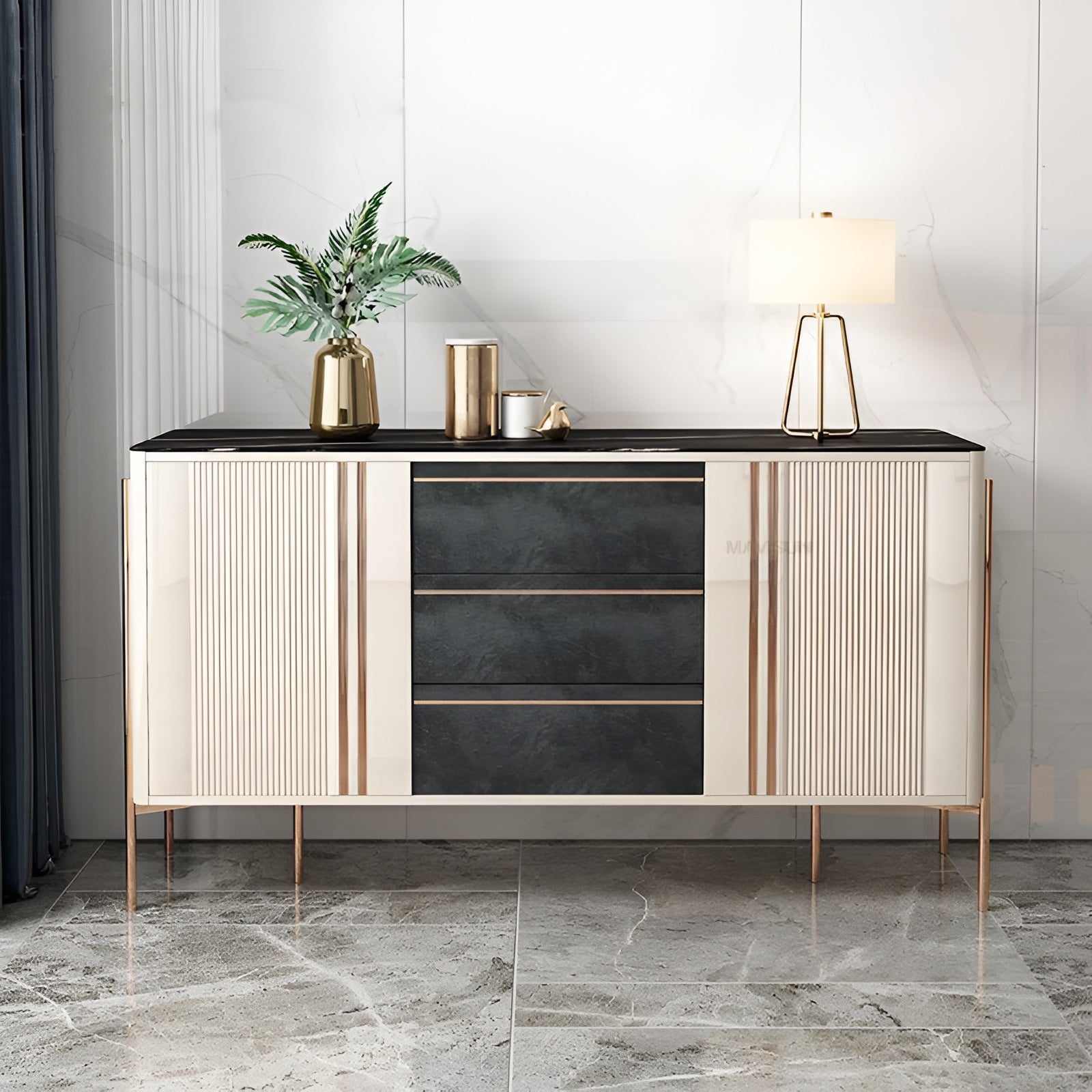 The tall, slender metal leg material, often in gold tone, provides stable support and a beautiful elevated look. Inside, you'll find ample storage with smooth-gliding drawers and spacious side cabinets. Thus, this Contemporary Marble Top Wooden Buffet Table is perfect for storing dishes, linens, or serving drinks while adding a sophisticated modern touch to your home.