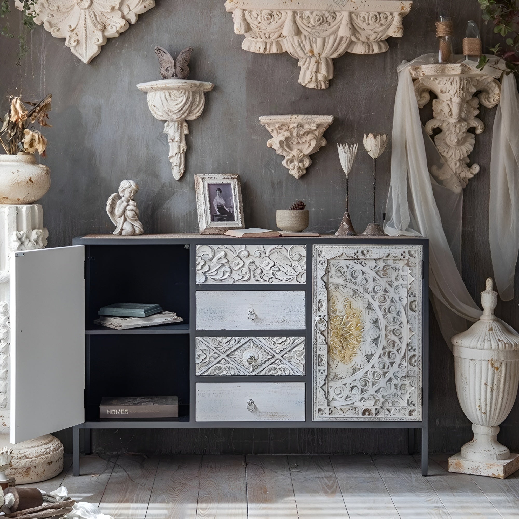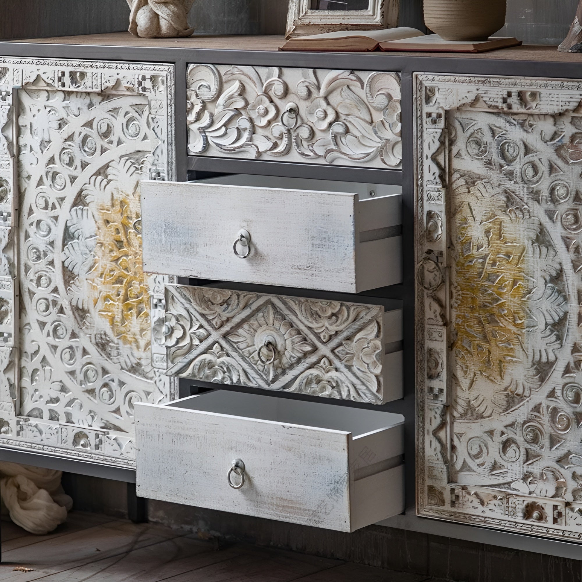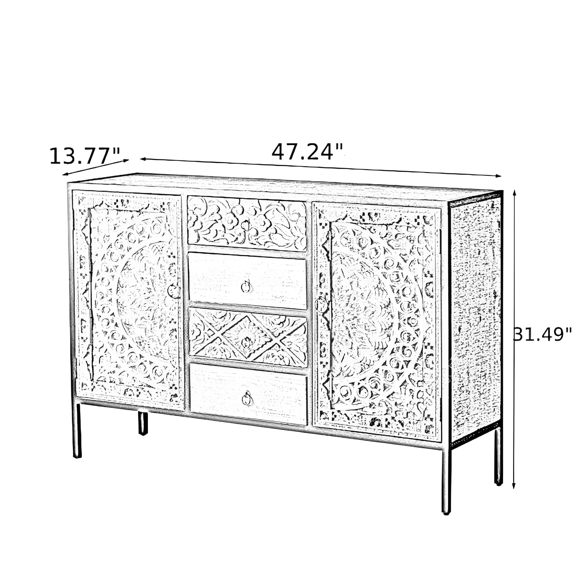 These Designed Wooden Crafted Modern Buffet Tables combine style and functionality, making them ideal for bringing a dash of vintage elegance to either modern or traditional spaces. This can be use as an Accent Buffet table in living rooms, bedrooms, or hallways due to their compact size. While the robust construction guarantees long-lasting durability, the finely carved details and expertly crafted legs add an additional layer of sophistication.