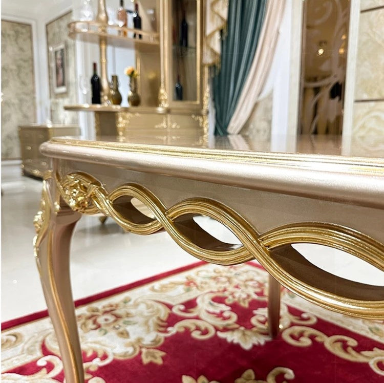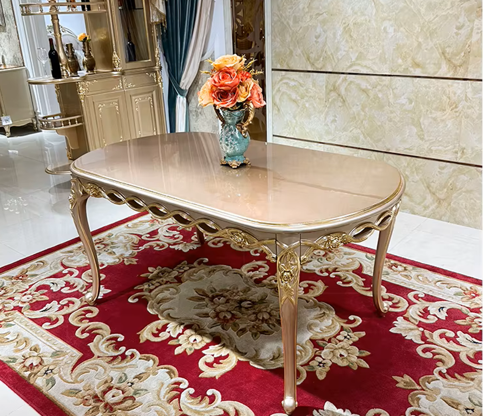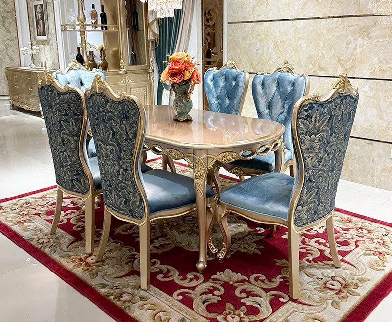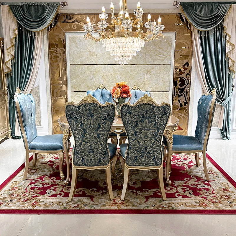 Each chair is made to be both fashionable and cozy with a sturdy wooden structure and plush velvet upholstery. This Wooden Dining Set features carved details that add to its royal appeal, with seats crafted using medium-density foam for long-lasting support. This European 6-Seater Wooden Dining Table Set turns your dining area into a traditional, hospitable setting that is ideal for family meals or get-togethers.