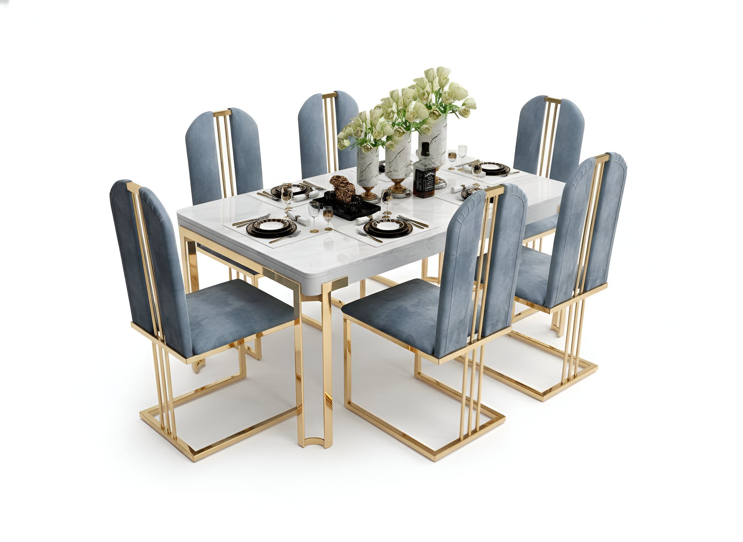 This Exotic Modern Marble Dining Table Set offers a unique blend of hi-tech style and classic versatility. The sturdy marble top adds a modern touch and serves as a luxurious surface for presenting meals. Its perfectly finished marble top enhances the bold design lines, making this modern dining table strong and visually striking.