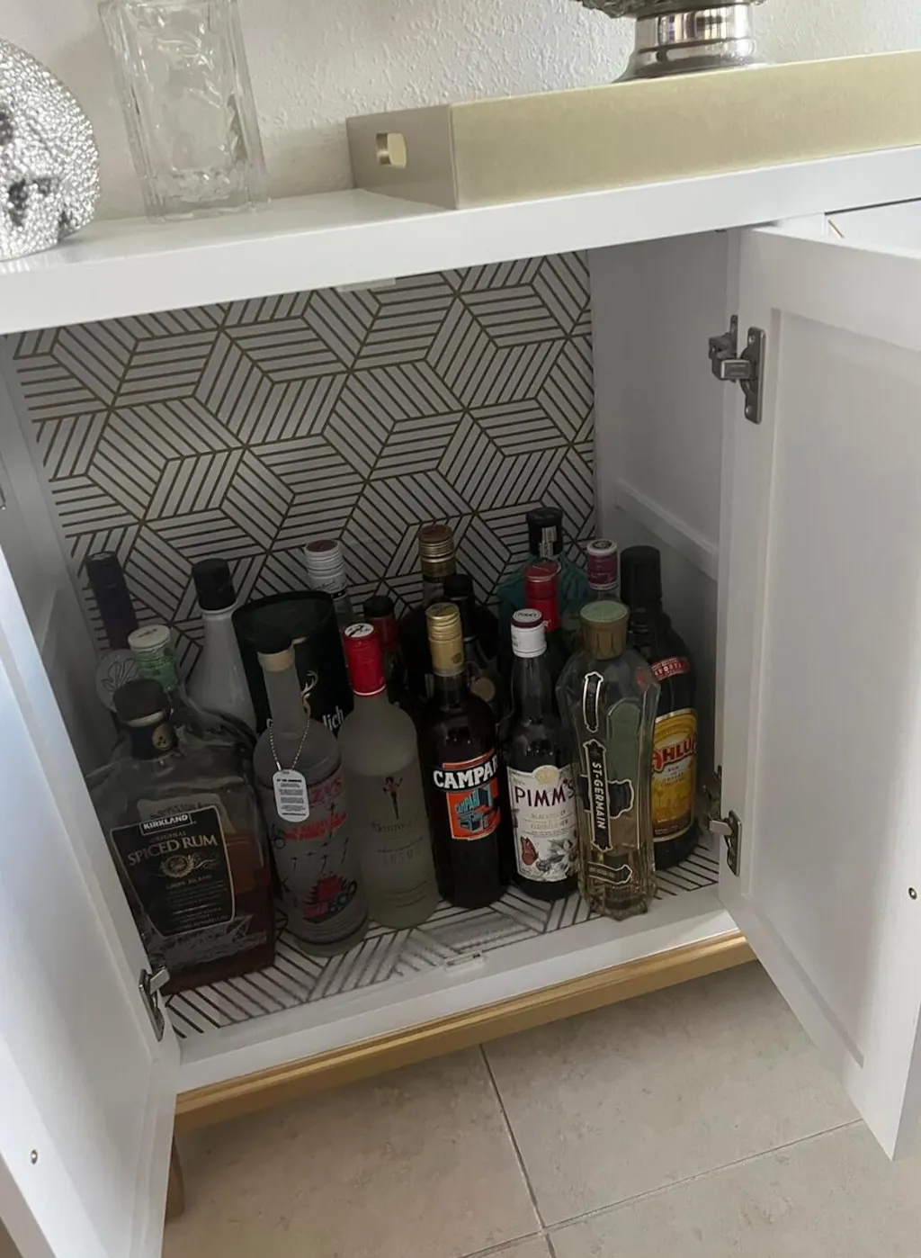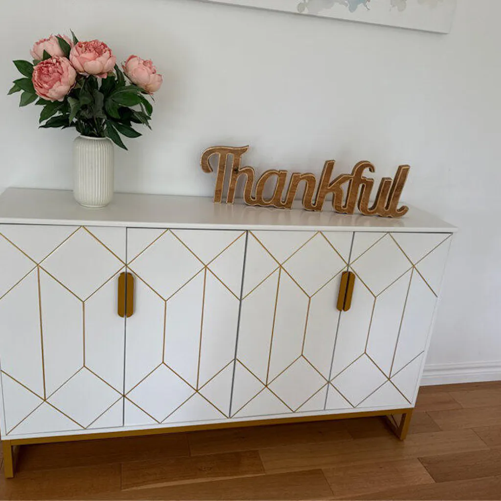 A stylish and multipurpose modern storage option, present the Functional Beauty Wood Buffet Cabinet With Gold-line Handles. With its stylish appearance, four doors, and movable shelves, this cabinet offers your kitchen or dining room plenty of storage space.