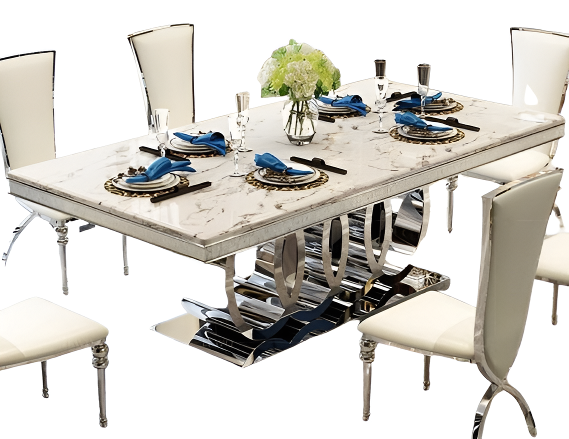 The Geometric Pattern Marble Dining Table-Set brings a clean, minimalist modern style to your dining room. The smooth marble table top of the marble dining table adds a bright and classy touch, while the sturdy metal base creates a bold geometric look. The matching chairs include soft faux leather upholstery, yet you can customize them with velvet fabric if you prefer.