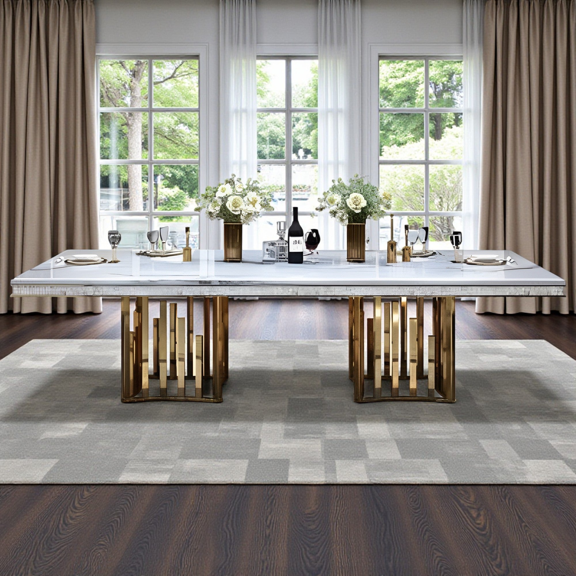 This Modern Dining Table guarantees long-lasting stability and a modern appearance thanks to its sturdy metal frame and fashionable metal legs. It is perfect for dining rooms because it is stylish and functional while offering ample space for gatherings. With its ideal balance of strength, style, and functionality, this contemporary dining table elevates every meal into a memorable event.