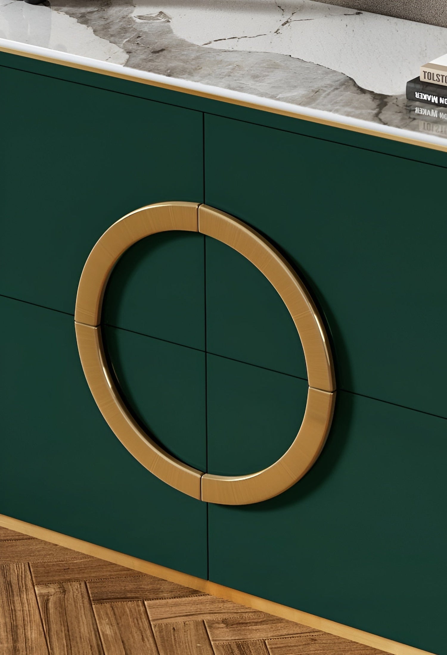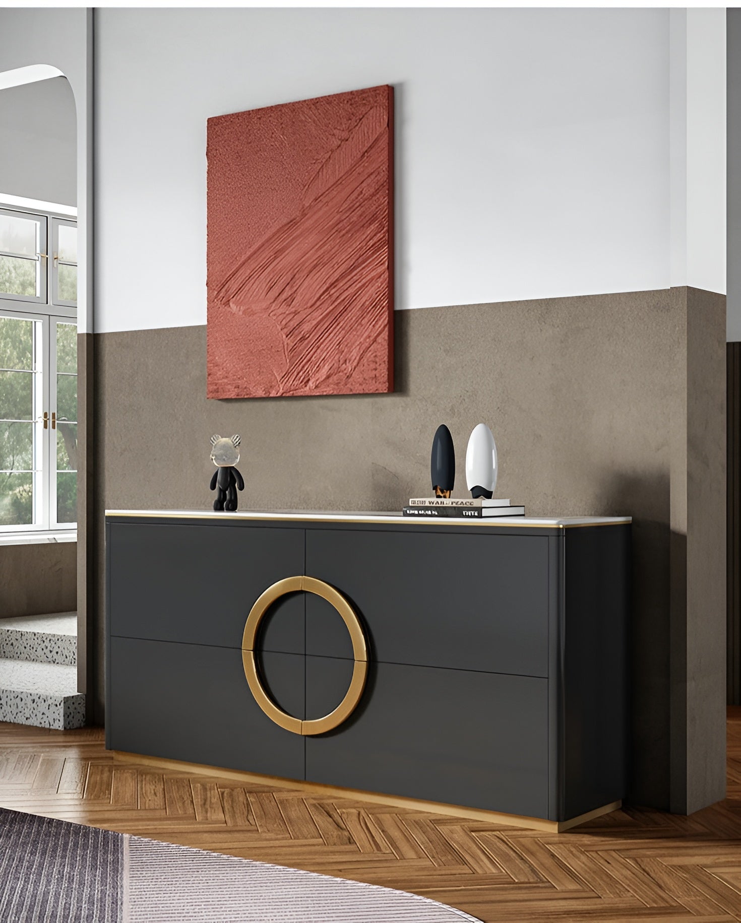 This Marble-Top Wooden Buffet Table with Storage is made up of a sturdy wooden structure, metal base, and sturdy marble top. Featuring four drawers for ample storage capacity, this Buffet Table offers plenty of space at the top for displaying items like photo albums, flower vases, books, and magazines. As the base and handles are made of metal it is anti-rust and anti-corrosive. Overall this is a good choice for use as an entryway side table. The Marble-Top Wooden Buffet Table with Storage's elegant charm will turn your dining area into an opulent setting.