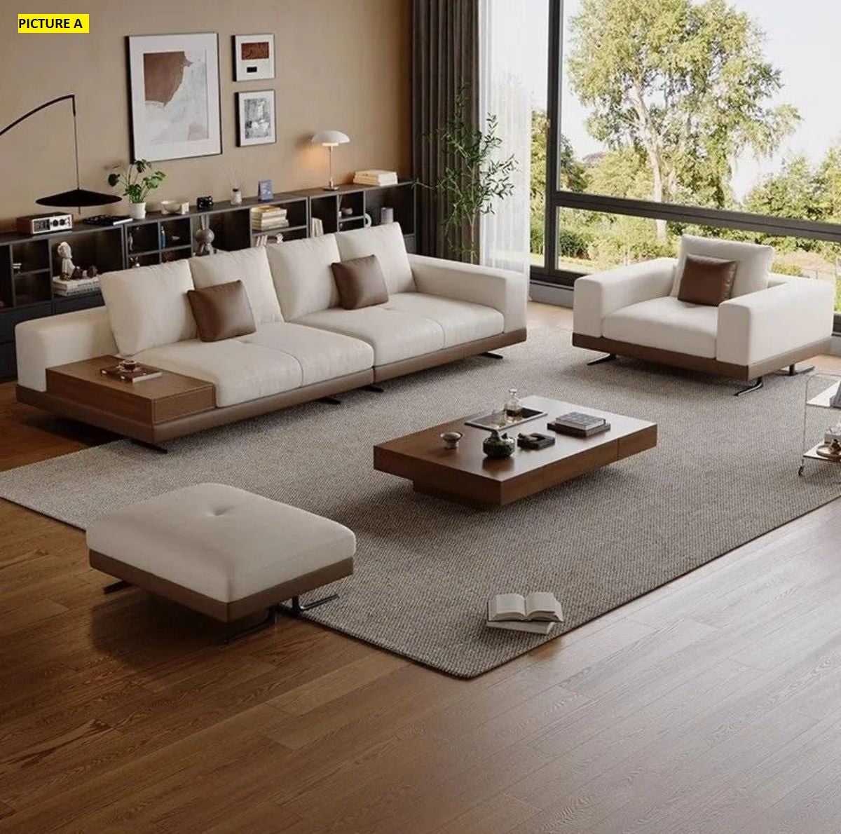 This sofa set comprises a roomy 4-seater, a comfy Single seater an stool, with a low profile. Additionally, its neutral colors easily match any decor. No matter if you are hosting or unwinding, this arrangement integrates smoothly into your way of life. This Minimalistic Leather Sofa Set transforms any room into a modern