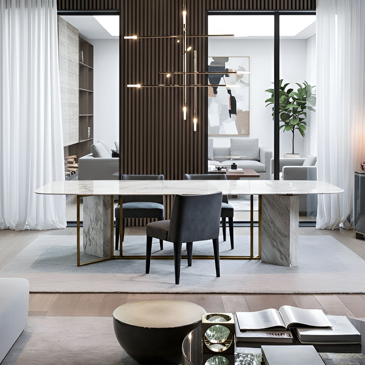 A Modern Appealing Marble Dining Table blends the opulent beauty of marble with sleek, modern design. This Modern Dining Table features a tabletop made of natural stone and marble with a sturdy metal base, making it an amazing example of true workmanship. A center point in any dining area, the polished, smooth marble surface provides a touch of refinement.