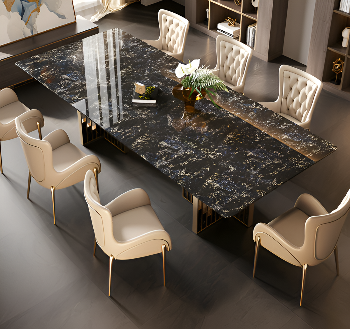 This Modern Marble Rectangular Dining Table has the capacity to emit a charm of contemporary elegance, deliver a beautiful look to your interior spaces, and mix in with the rest of the eating area thanks to the bold appearance and sleek shape of modernity. This Marble Dining Table features a smooth marble surface and modern style that lend durability and elegance, making it ideal for both special events and daily meals. The Modern Marble Rectangular Dining Table is robust and steady because of the sturdy metal legs that hold it aloft. This Rectangular Dining Table's robust design assures years of dependable use and a pleasurable dining experience.