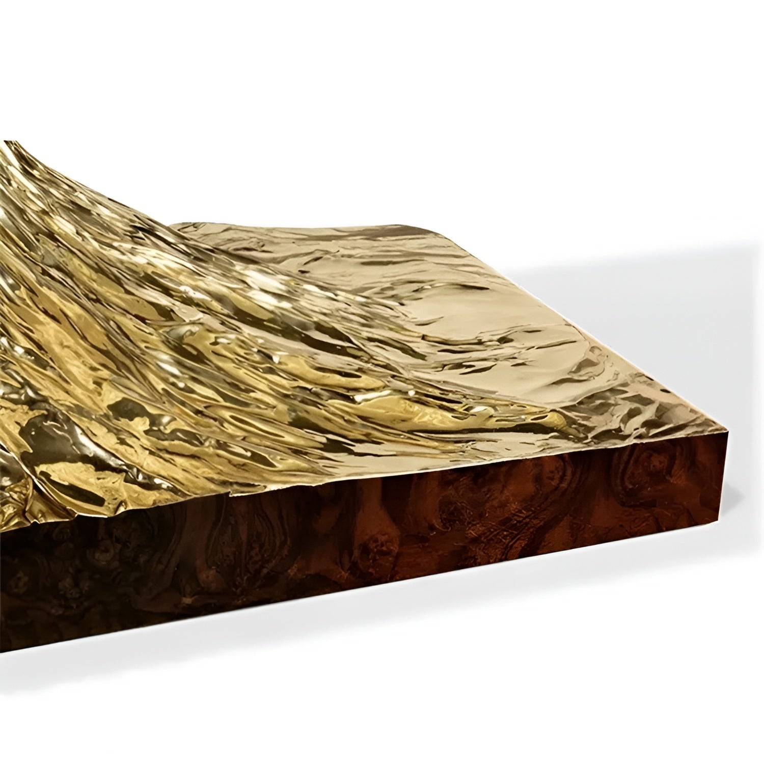 To guarantee enduring comfort, each chair is made with a sturdy metal frame, covered in soft velvet, and packed with medium-density foam. The bold centerpiece design of the table is perfectly complemented by the smooth touch of the wooden base.