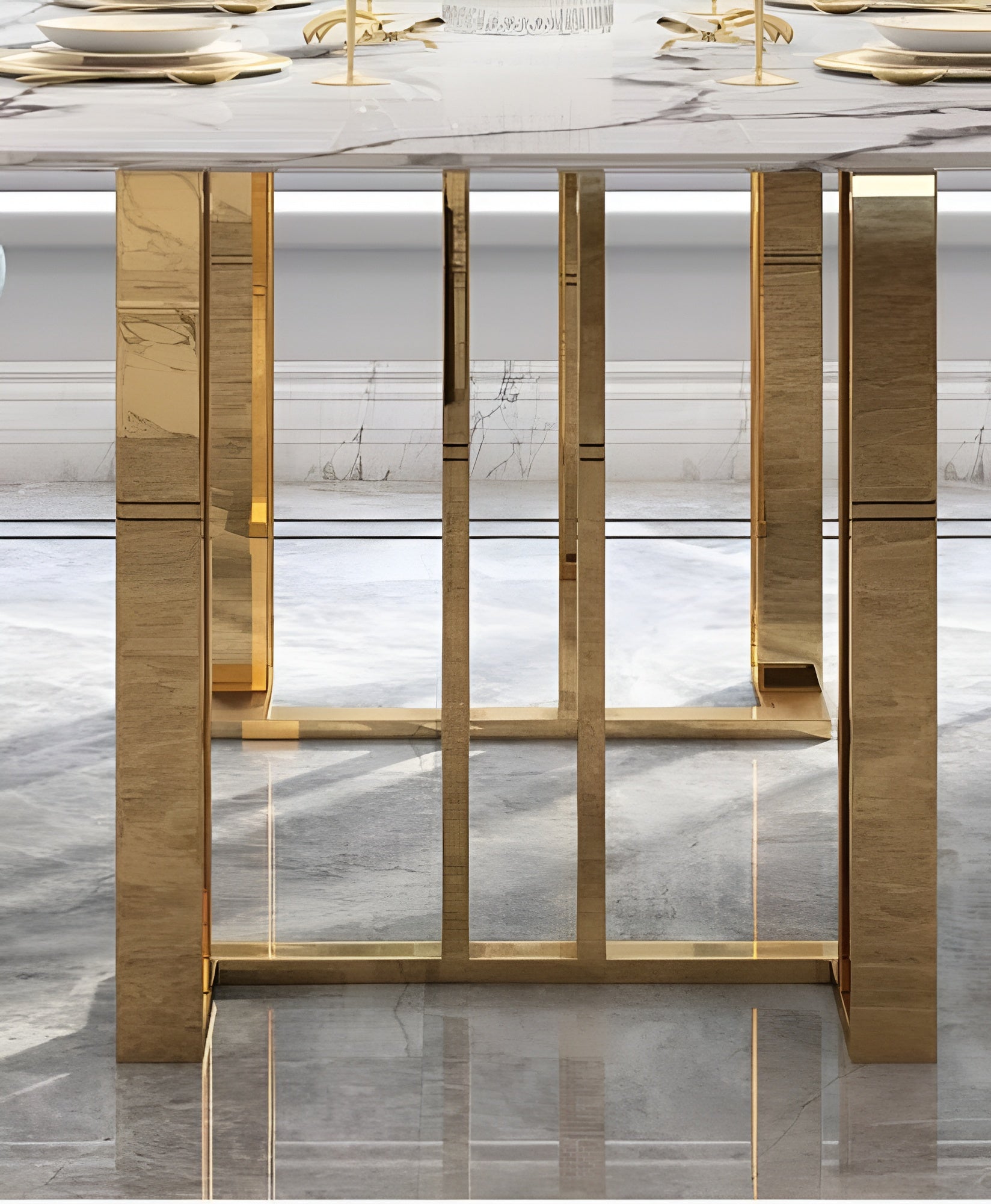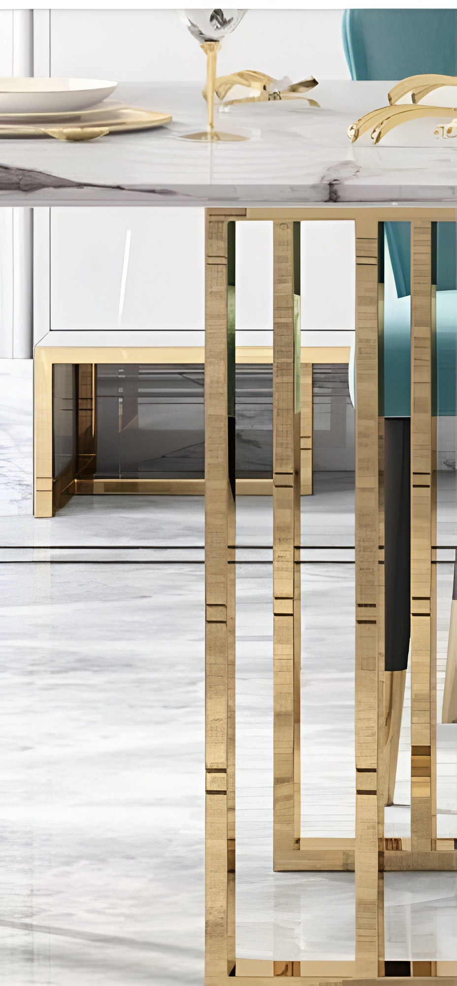 Additionally, you can customize this Nordic Dining Table to match the décor of your interior. Every meal feels special thanks to its golden metallic finish, which adds a touch of sophistication. This Nordic Metallic Marble Dining Table combines style and functionality to create a cozy and welcoming space in your home, making it ideal for hosting guests or family dinners.