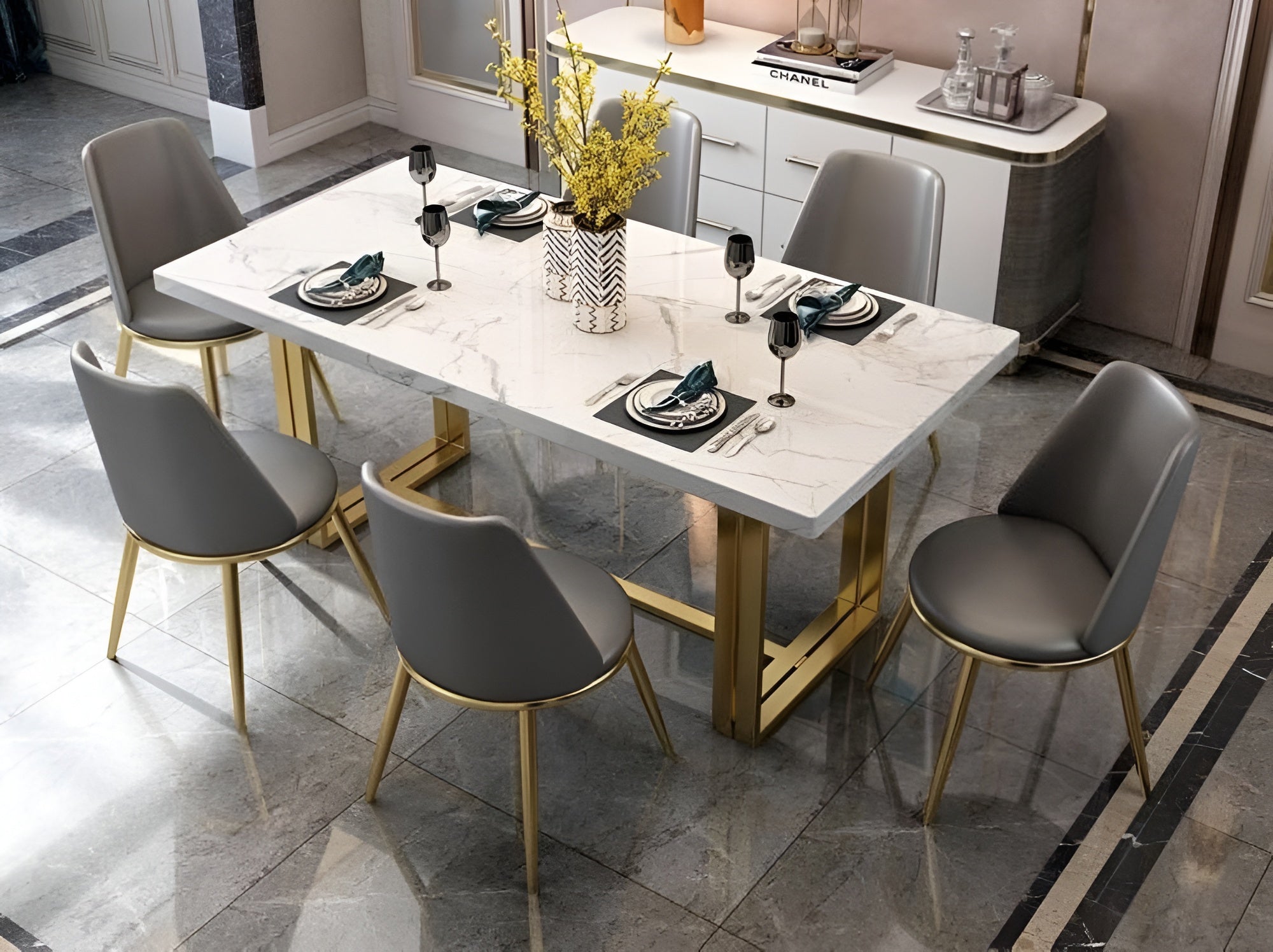 The perfect combination of metal and marble gives this Luxurious Dining Table Set a stunning look, thanks to its sturdy metal frame and high-quality materials. The cozy leather chairs add a perfect look to the dining table. The addition of a Shine Luxurious Marble-Top Dining Table Set beautifully changed the dining area.