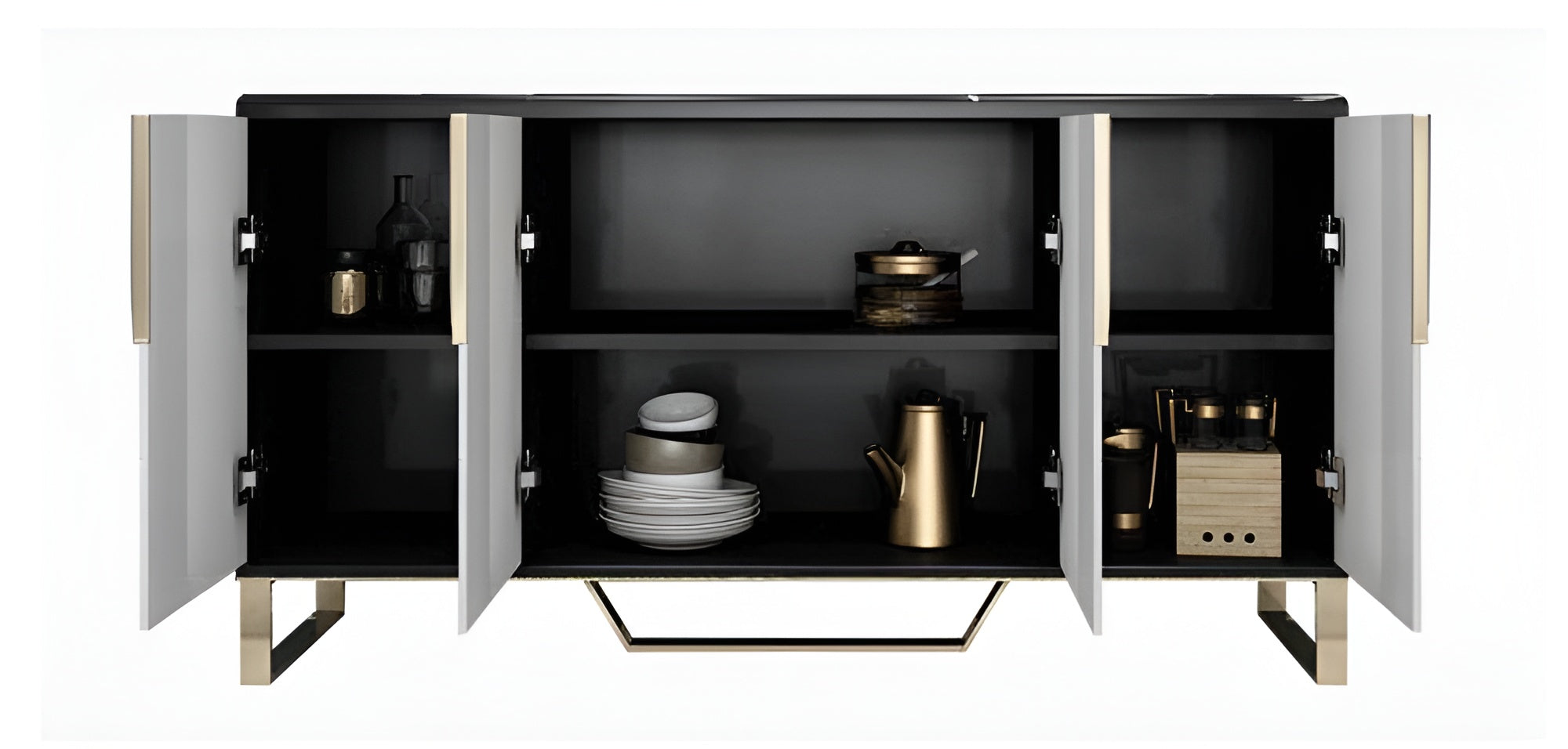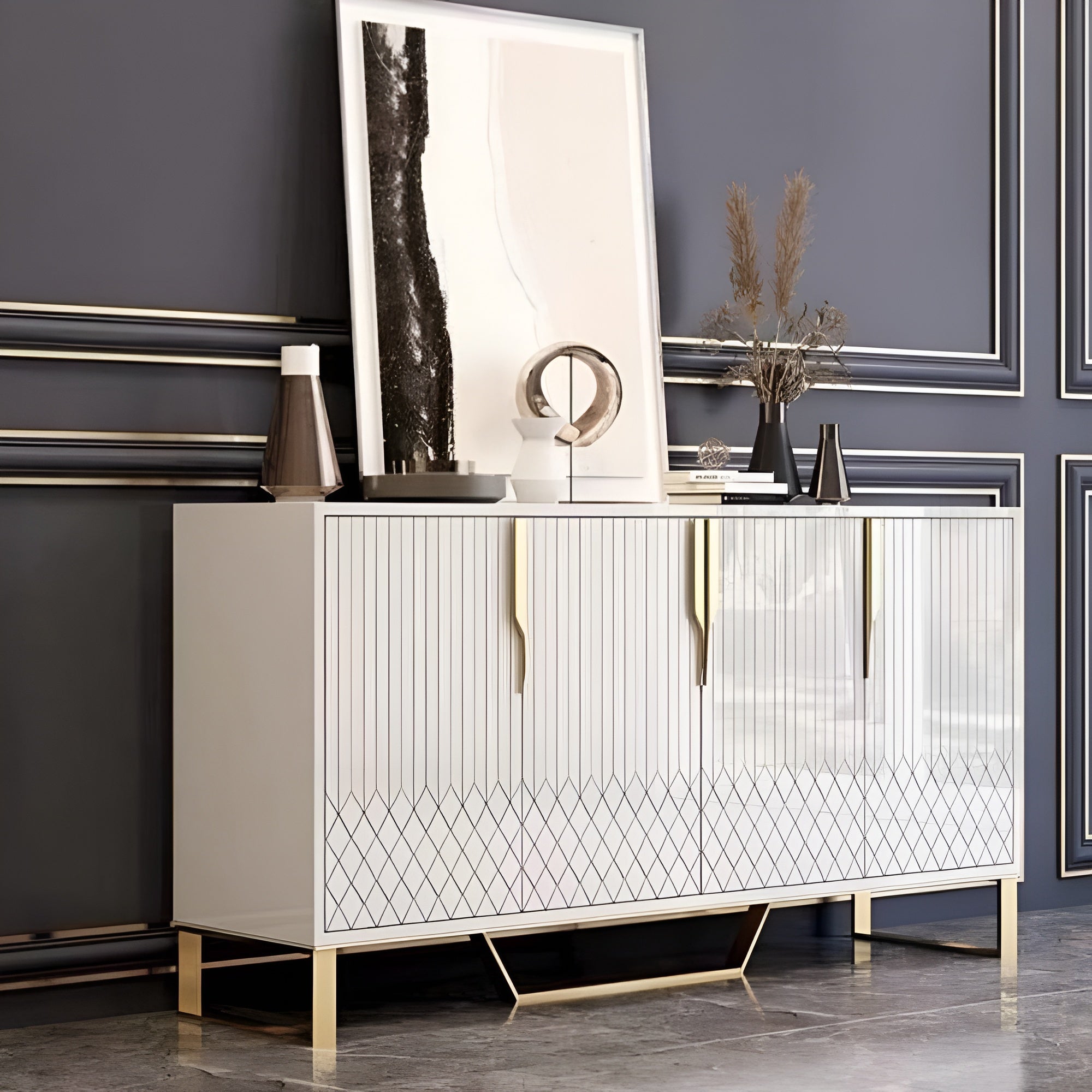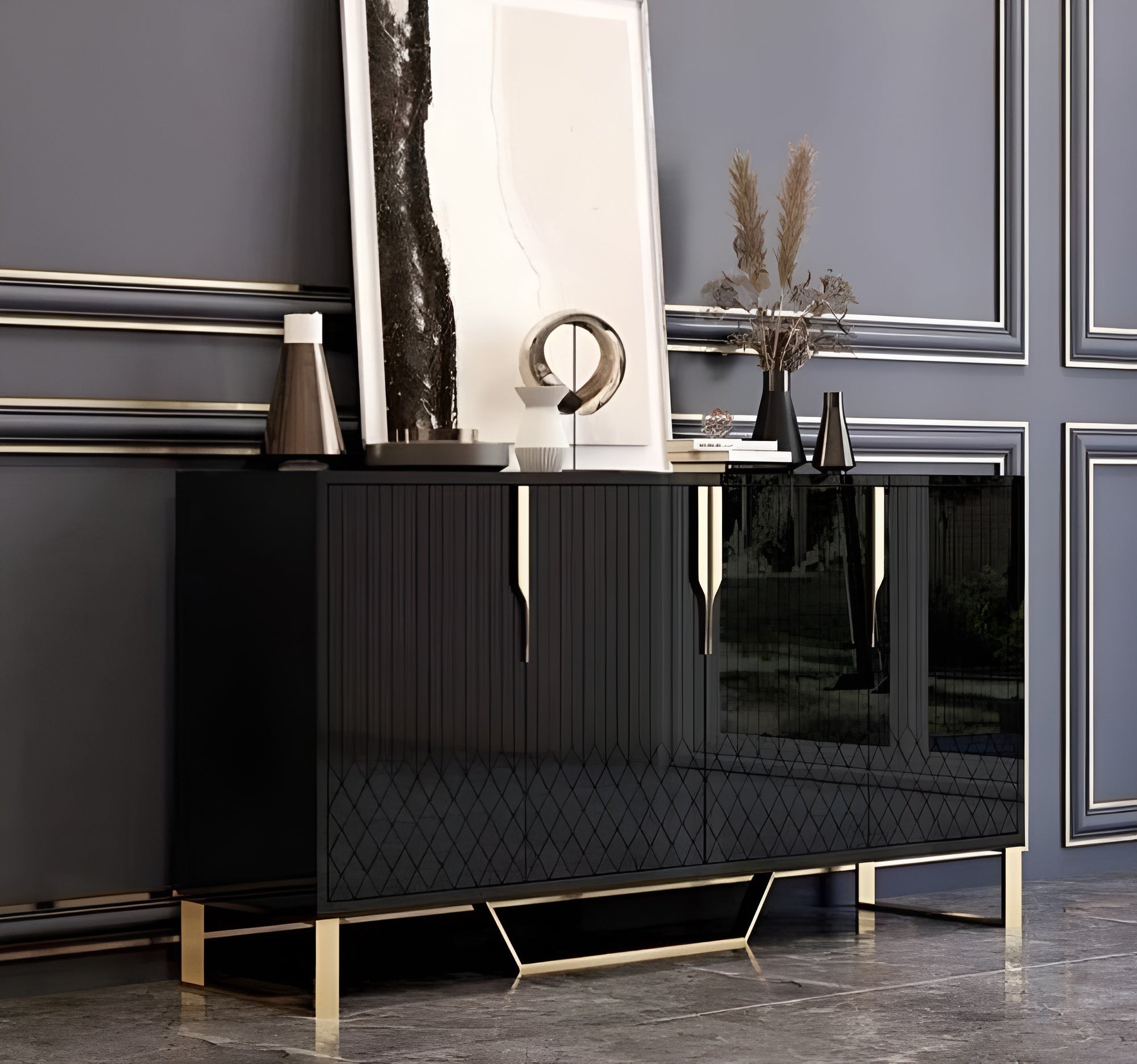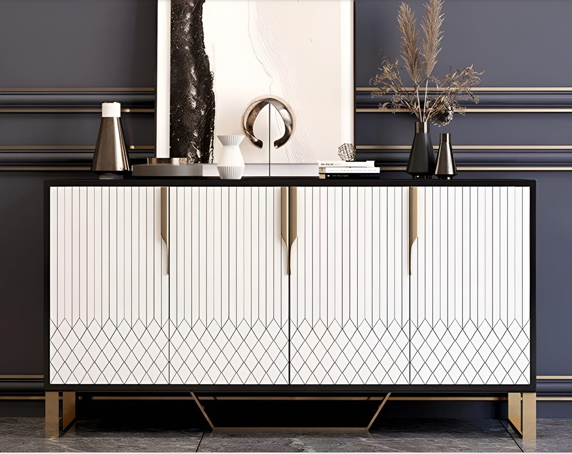 This design upgrades this buffet table concept with a glitzy and glamorous twist. The marble tabletop provides a glossy and stable base for decorative display. The trendy, Versatile Buffet Table with Marble-Top Surface is a unique addition to any home.