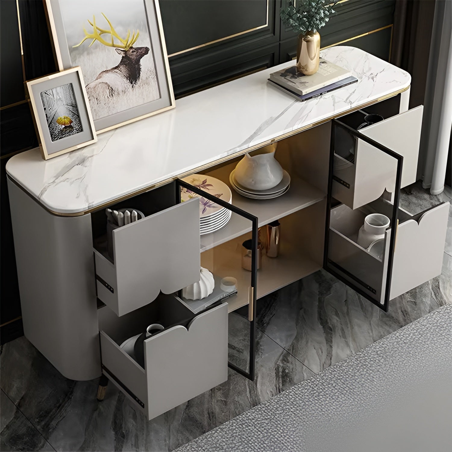 A classic piece that adds style to any dining area or living area is the Wooden White Buffet Table With Marble-Top. The table's exquisitely polished marble top and wood construction give your décor a refined look. This buffet table, which was designed with both style and functionality in mind, has a cabinet and roomy drawers for plenty of storage, making it ideal for keeping dining utensils like glassware, linens, and silverware organized.