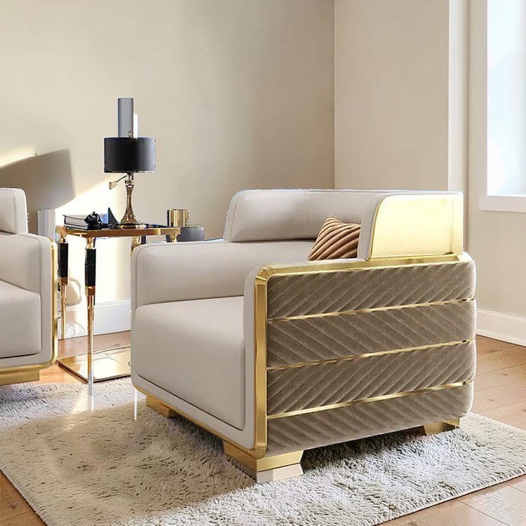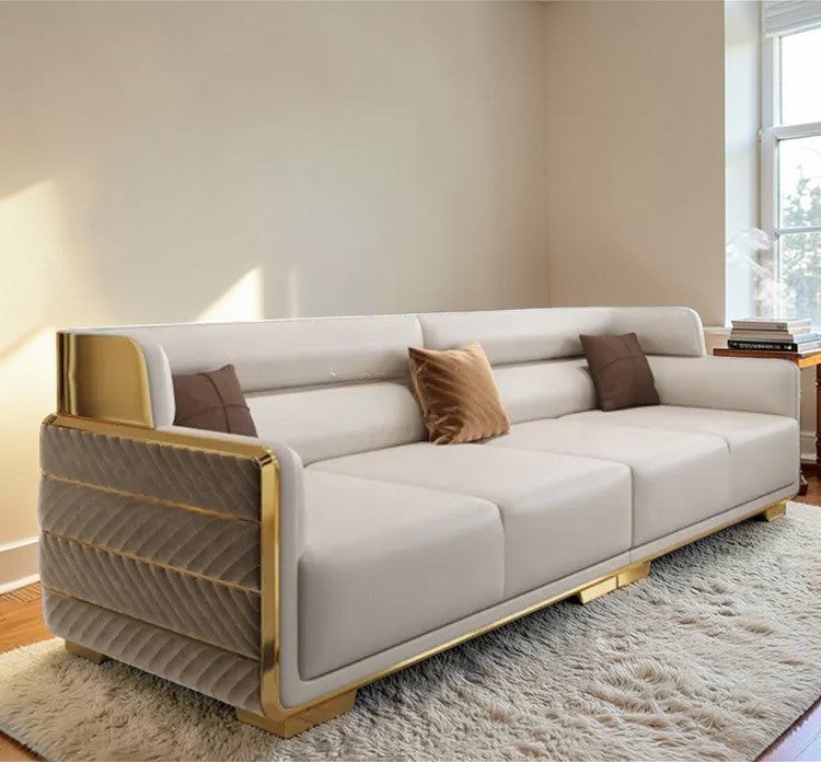 Elevate your Living Room with our exquisite 3-Piece Indoor Leather Sofa Set, the true epitome of opulence and comfort. The solid wood frame provides stability and durability while the leather upholstered Sofa adds a touch of luxury and is easy to clean. The fabric covering on the back side offers a pleasant contrast, and the golden-colored metal legs provide a contemporary and stylish look.