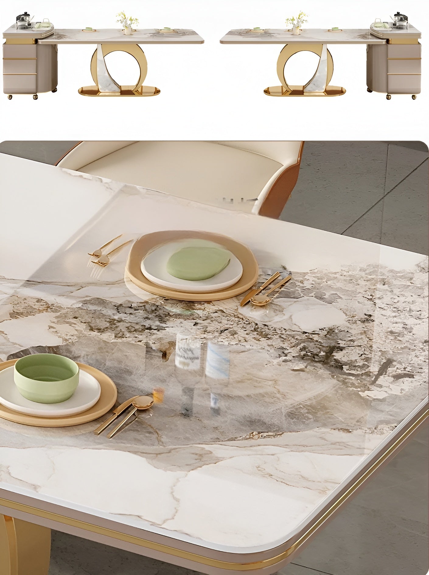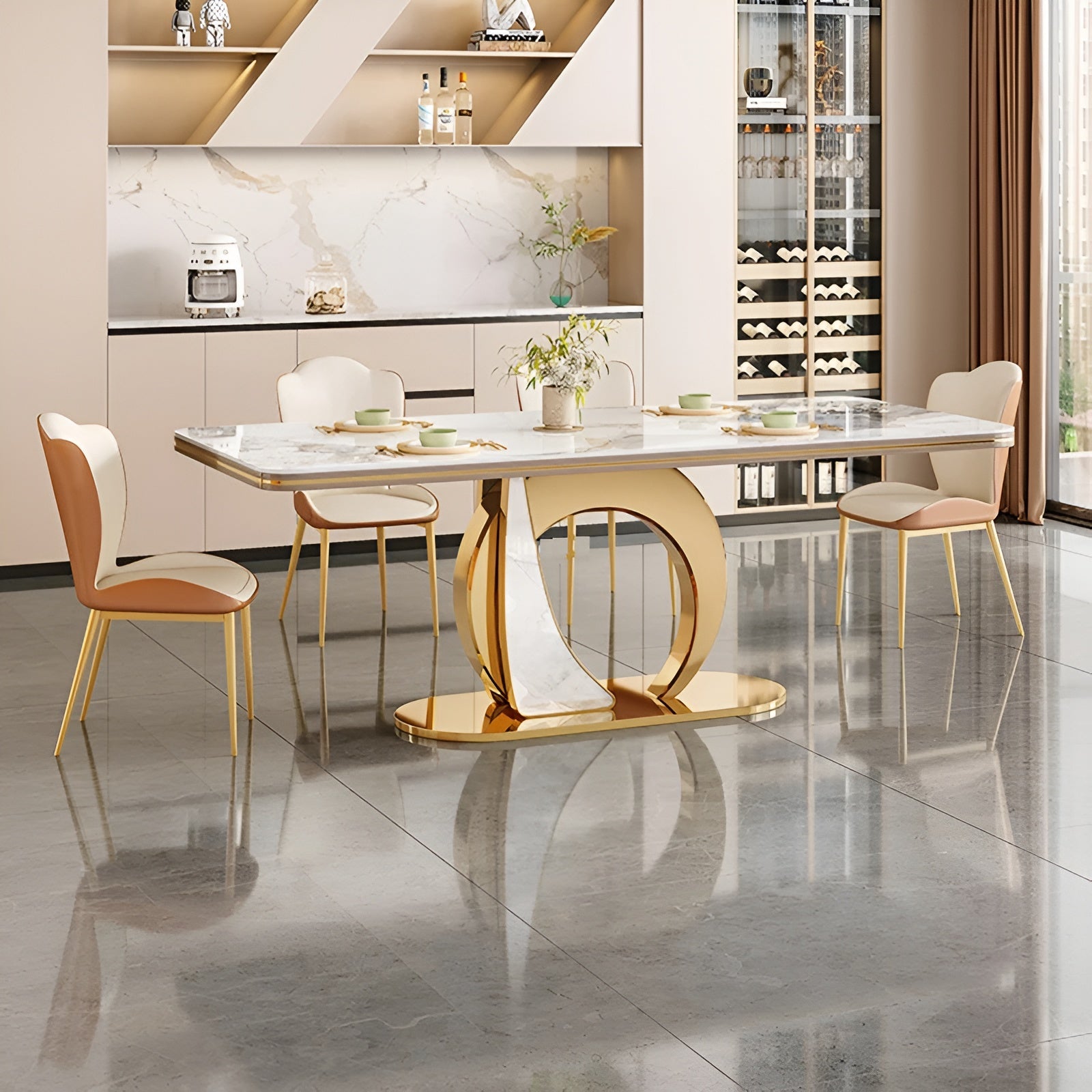 This Abstract Gold Marble Dining Table Set will add charm to your dining room. The table has a sturdy golden color metal frame and base and a gorgeous marble tabletop. This Marble Dining Table Set features six nicely designed chairs upholstered in faux leather, providing a pleasant and fashionable seating experience. The chairs have shiny golden-finished legs and an abstract body design, bringing a sense of modern luxury to your space. This Abstract Gold Marble Dining Table Set is a gorgeous addition to any modern house since it blends refinement and durability making it perfect for both informal dinners and important occasions.