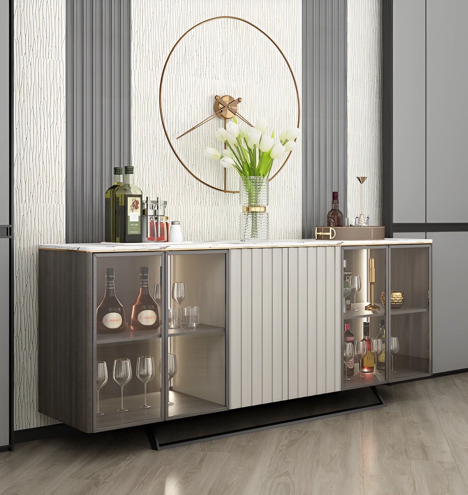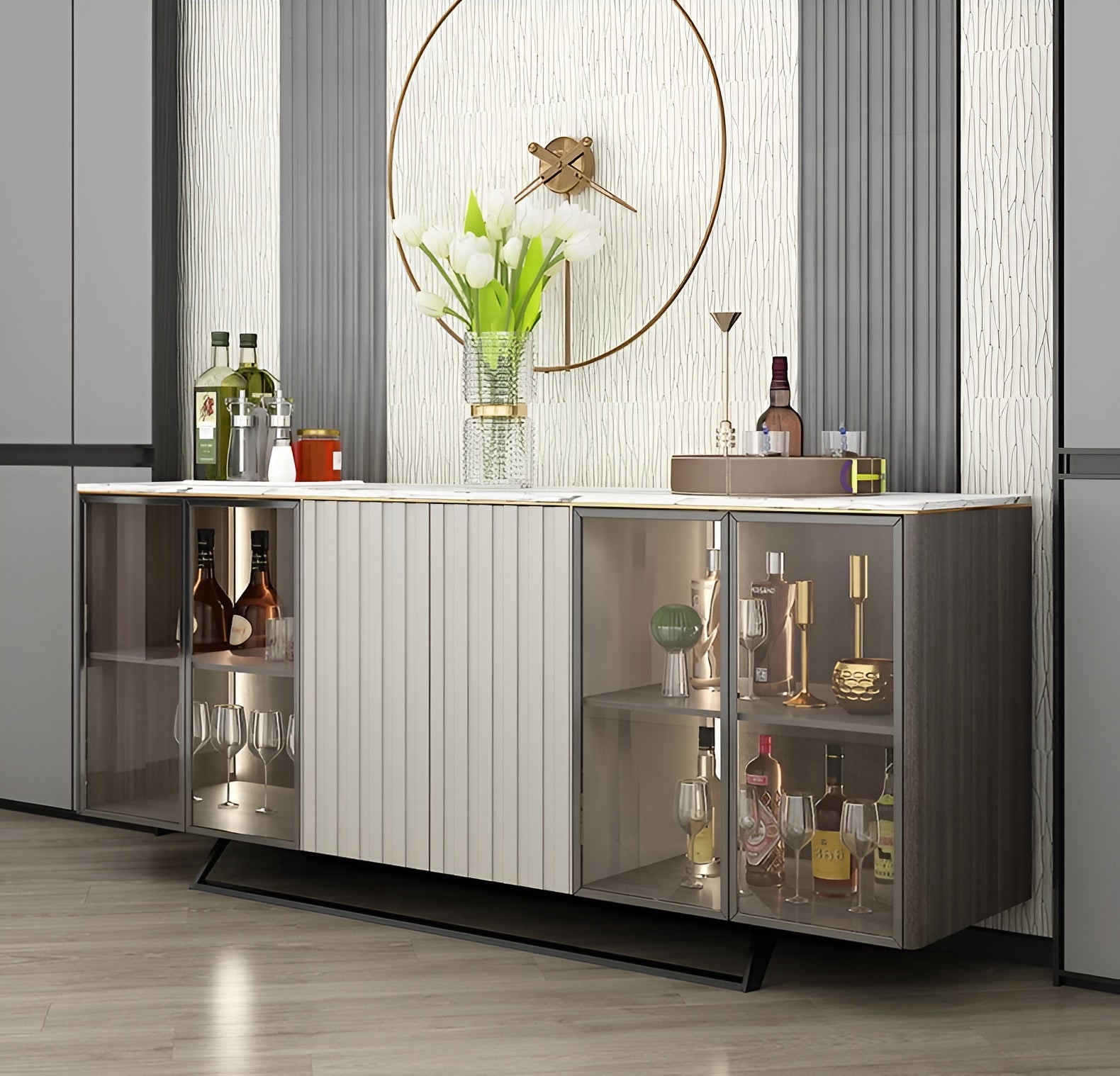 Designed for ample storage, this Wooden Buffet Table includes glass display cabinets on each side, perfect for showcasing your finest glassware and spirits. The central wooden doors offer discreet storage for other essentials. This humanized design blends functionality with modern aesthetics, making this Ample Storage Marble-Top Wooden Buffet Table a perfect addition for those who appreciate elegant organization.