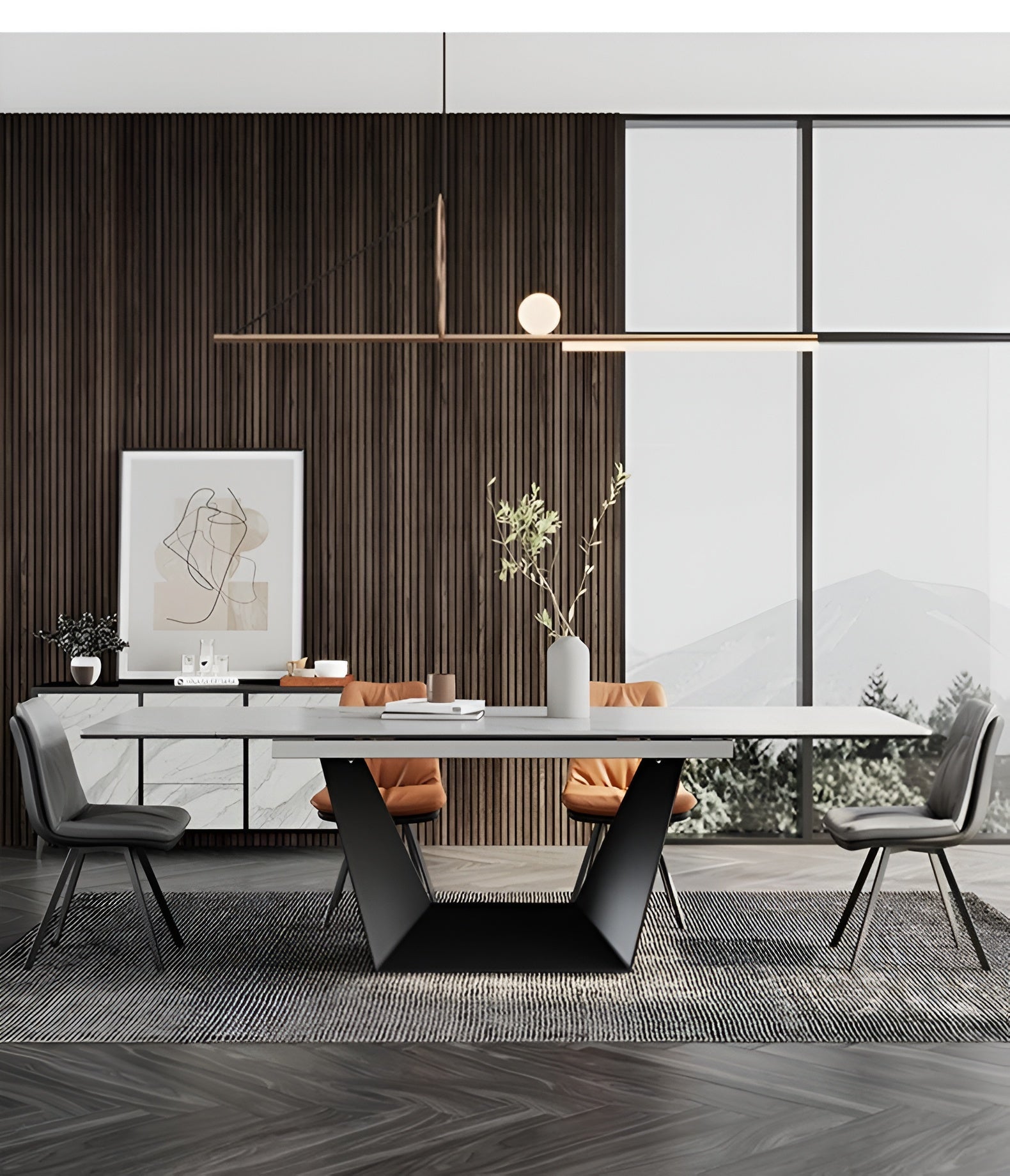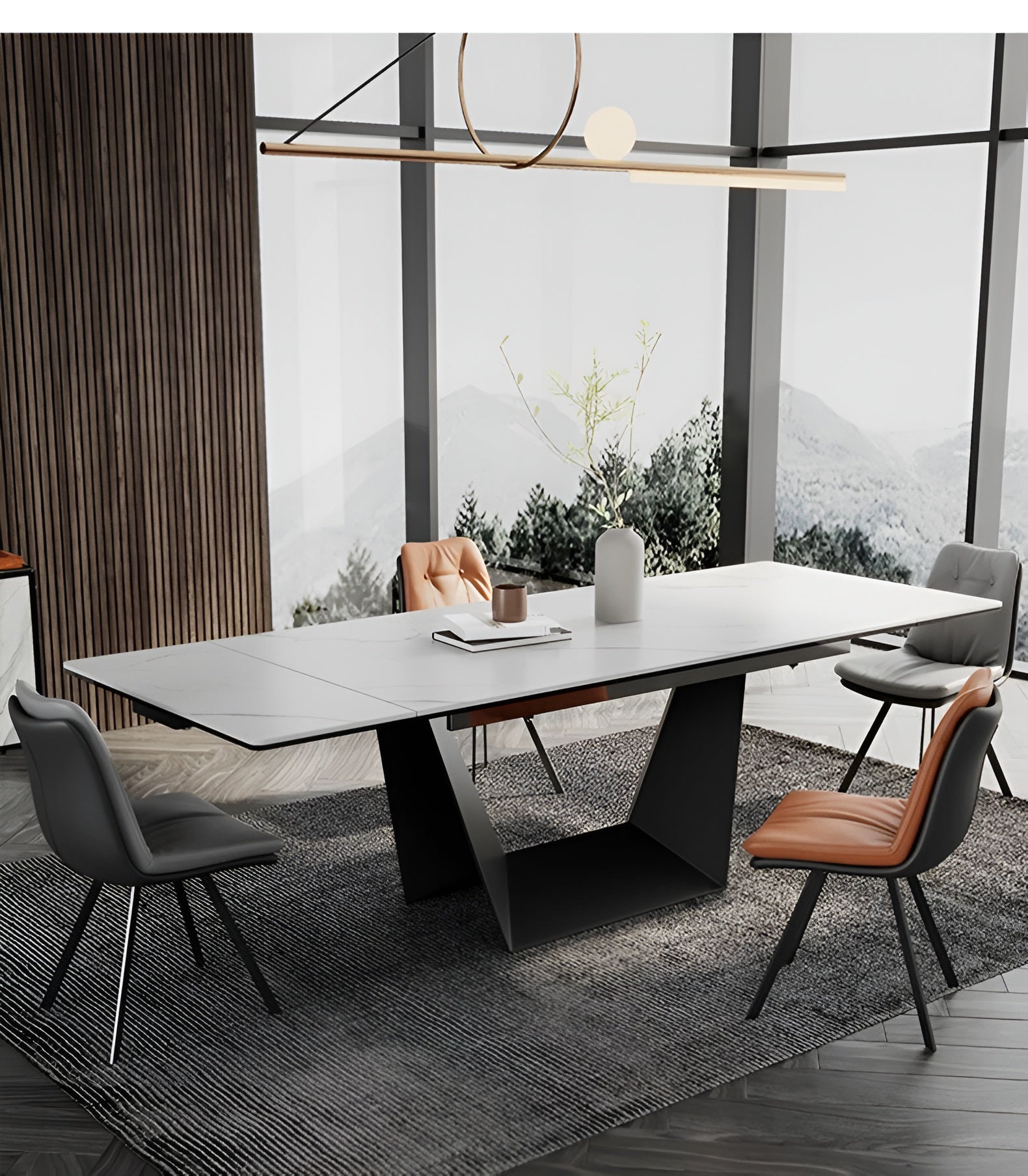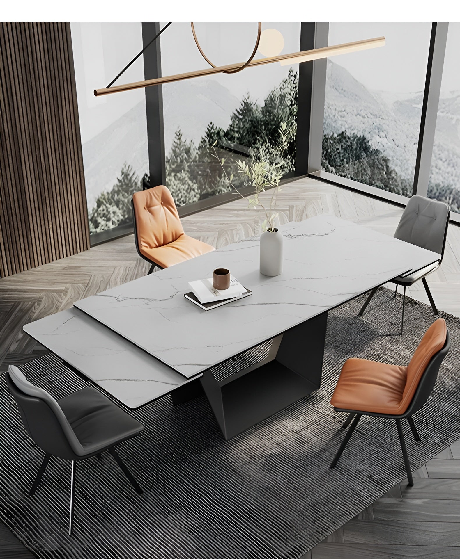 Introducing our stunning Artful Extendable Marble Dining Table Set, the perfect combination of style and practicality. The marble dining table has a unique look with its smooth lines and natural grey veins that are sure to leave a lasting impression on your guests. This table is cleverly designed to expand, so it can easily accommodate more people.