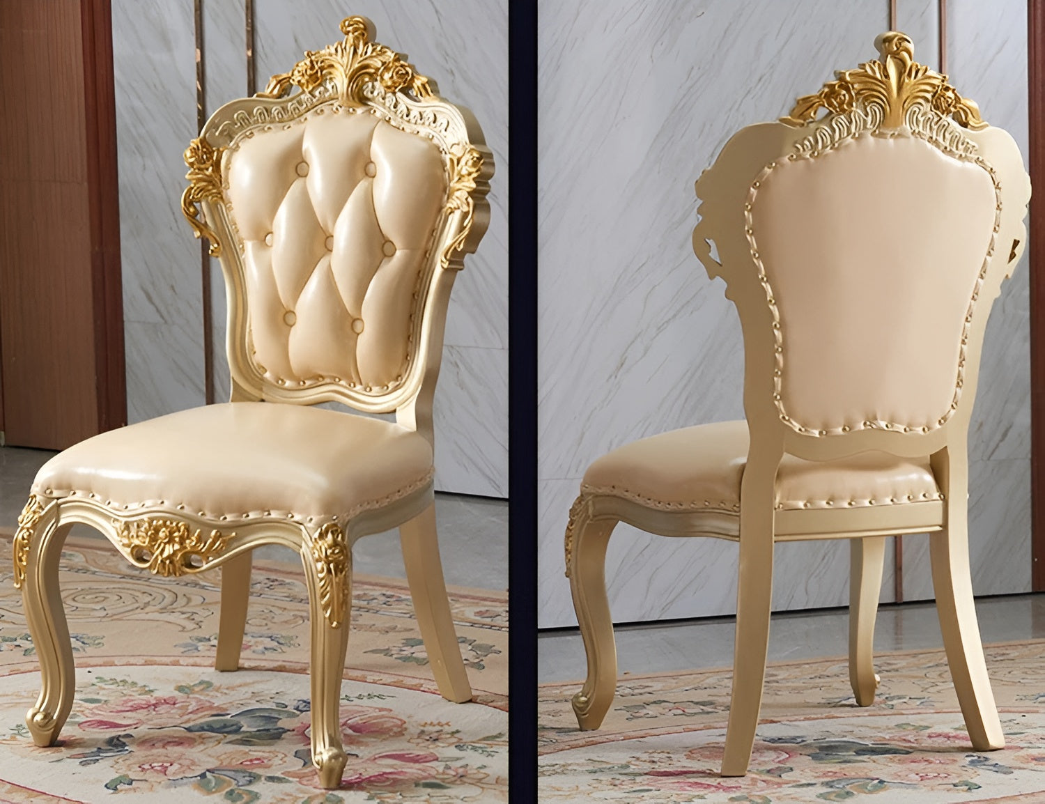 The button-tufted design on the chair backs gives a classic touch, while the golden-colored carved wooden frame creates an outstanding finish. The Brusten Dining Table Set has a solid wood leg material that strengthens the entire chair, strengthening its structure. This Brusten Wooden Carved European Dining Table Set with the wooden frame, increases the positive vibe of the dining area.