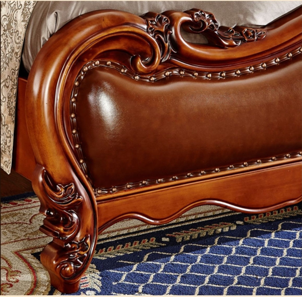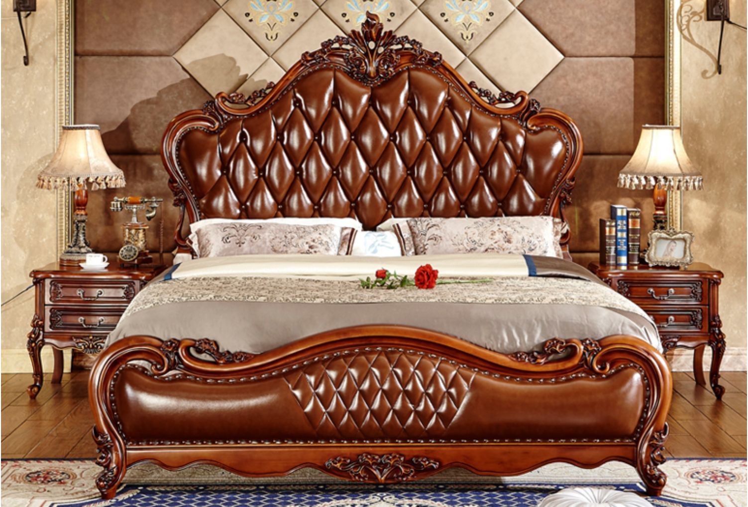 A Classic European Design Leather Bed is a stylish and elegant bed that combines luxurious leather upholstery with a traditional European design. These beds are known for their beautiful carvings and balanced shapes. They often feature adorned designs inspired by traditional European styles.