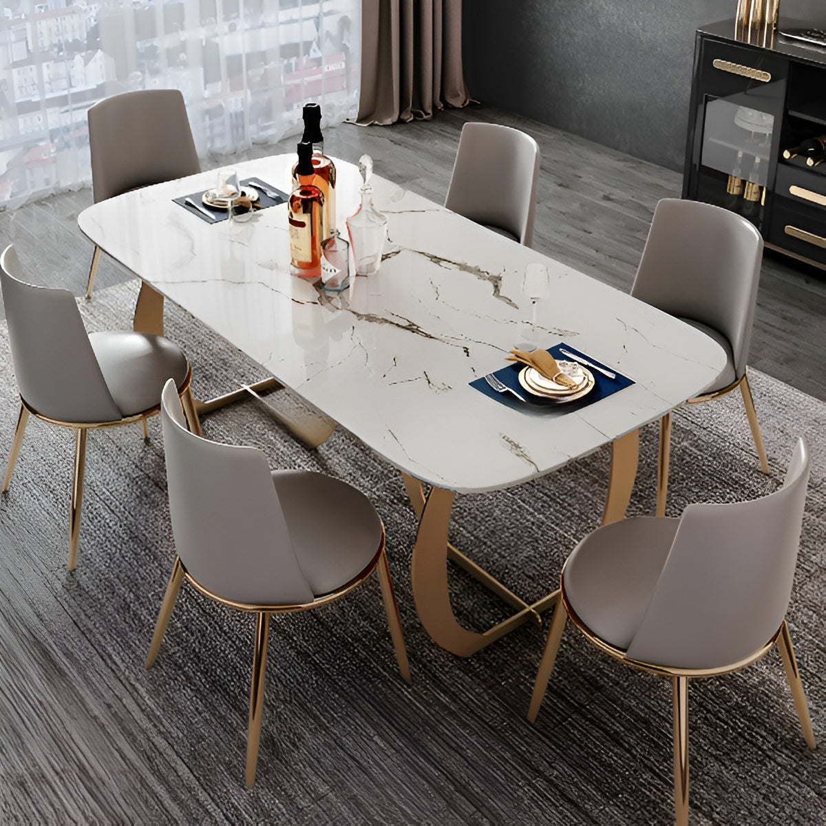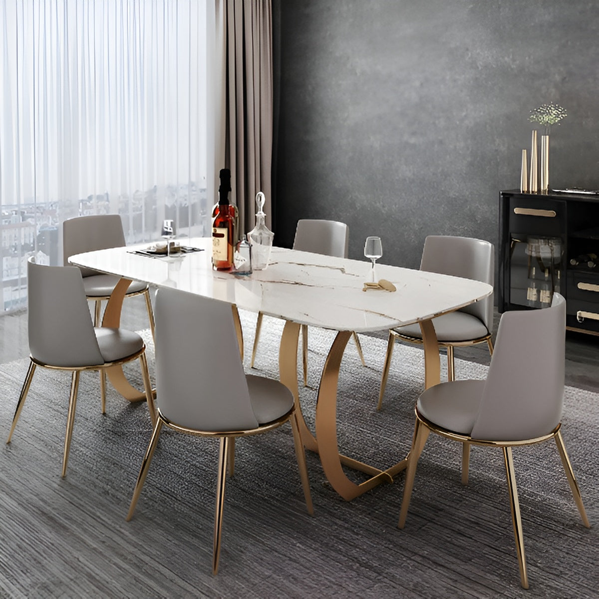 The perfect combination of metal and marble creates a stunning look, thanks to its metal frame and high-quality marble top. The cozy leather chairs add the perfect finishing touch to the marble dining table. The design of the conventional rectangular marble dining table set elevates any dining area by blending style with functionality.