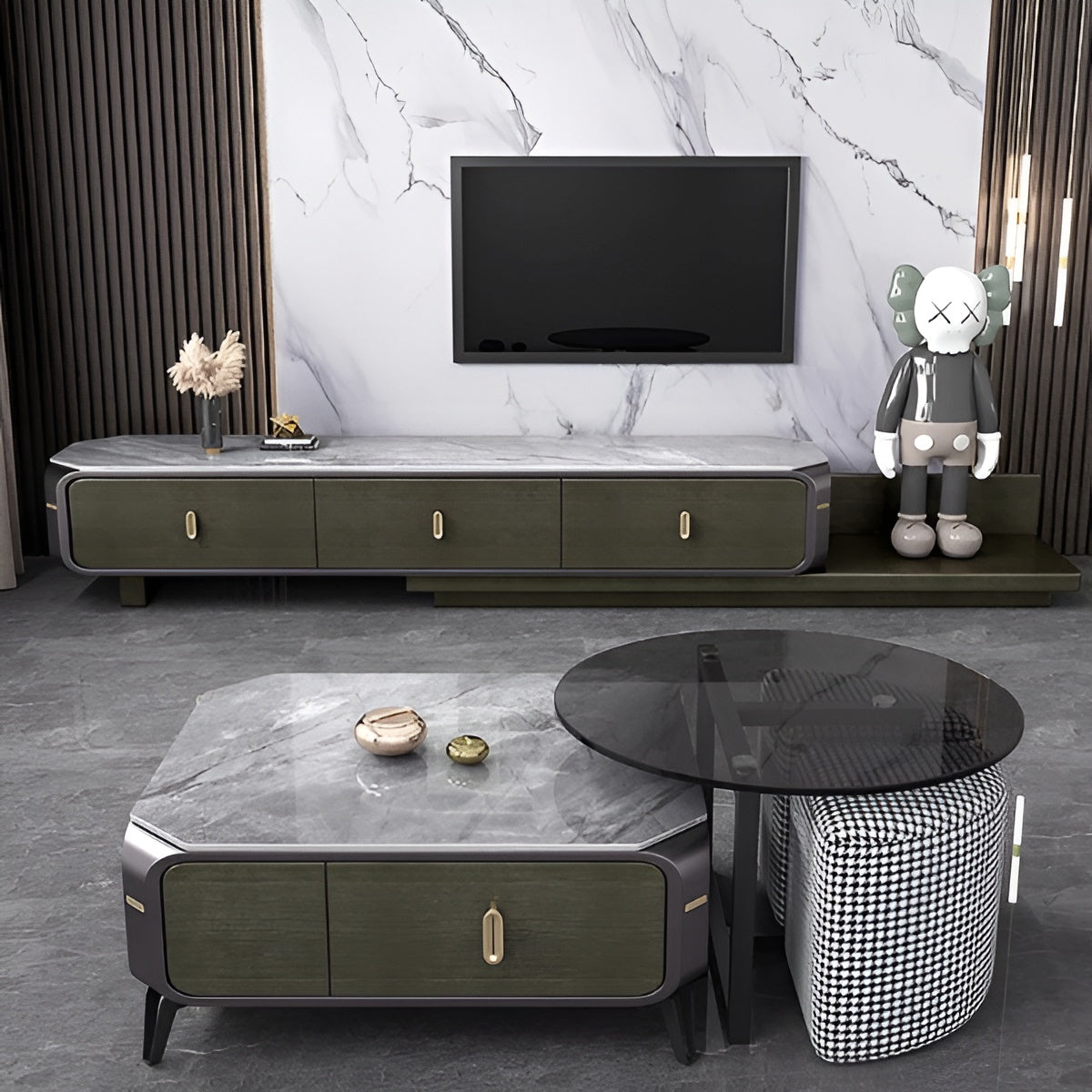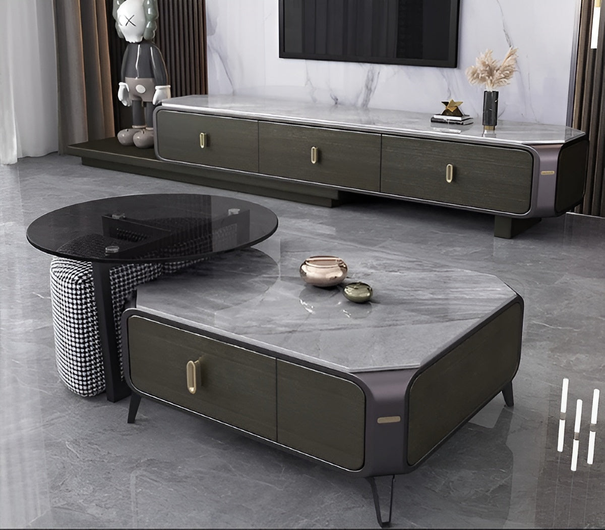 The modular coffee table features a marble top and tempered glass side table, which are supported by silent hydraulic hinges and solid wood drawers for smooth operation. A matching low stool with a metallic paint finish adds refinement and sparkle. Dynamic Design Duo Retractable TV Stand And Modular Coffee Table Set is the perfect choice.
