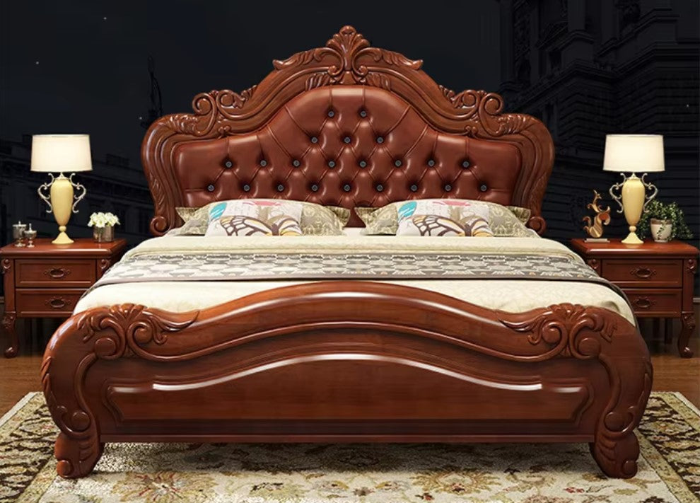 European Carved Wooden Leather Bed - Lixra.com