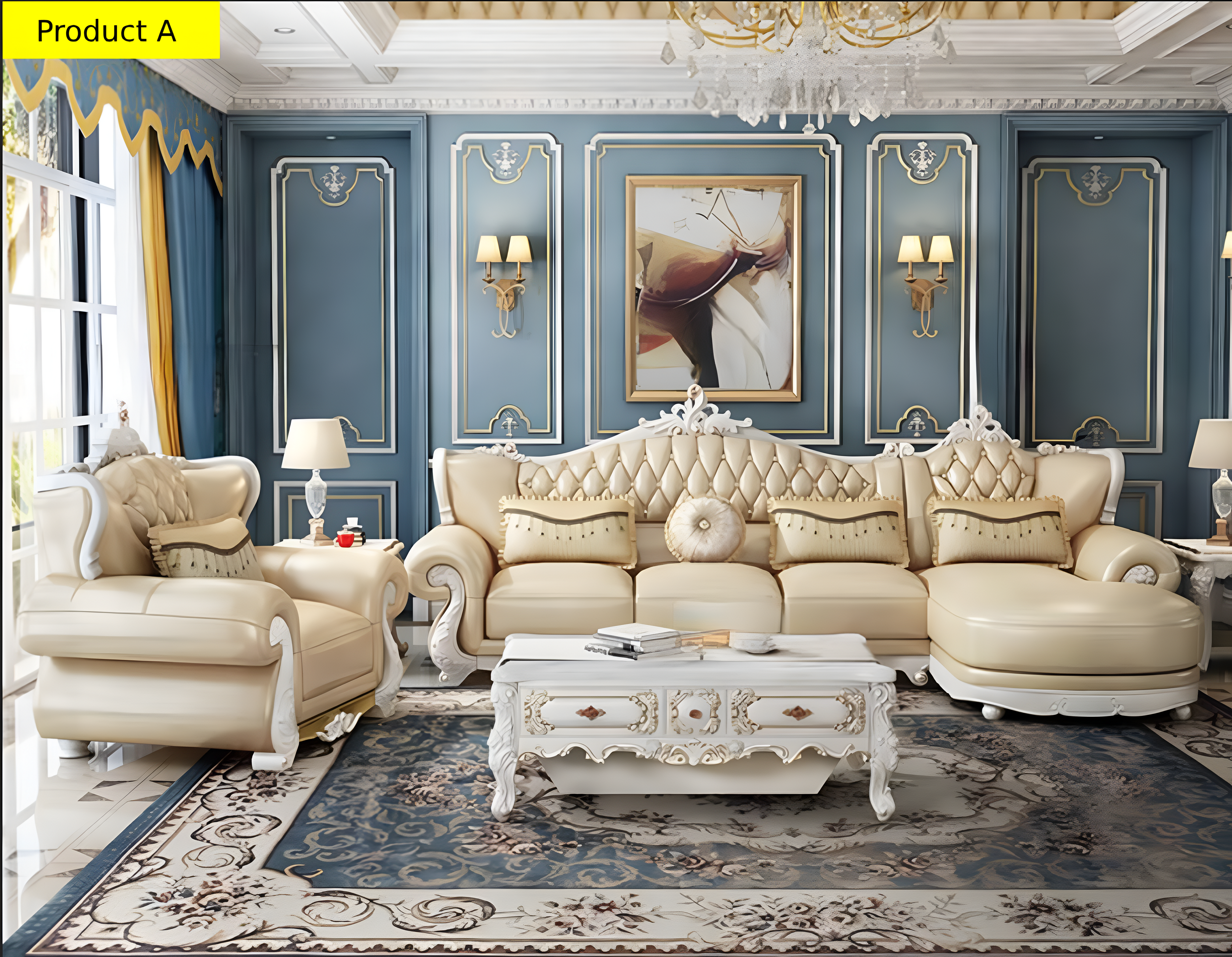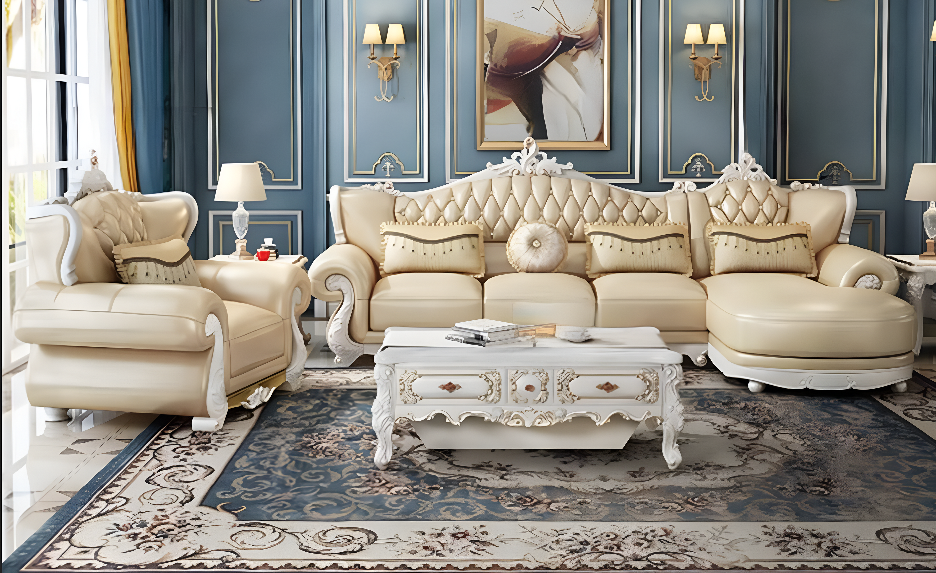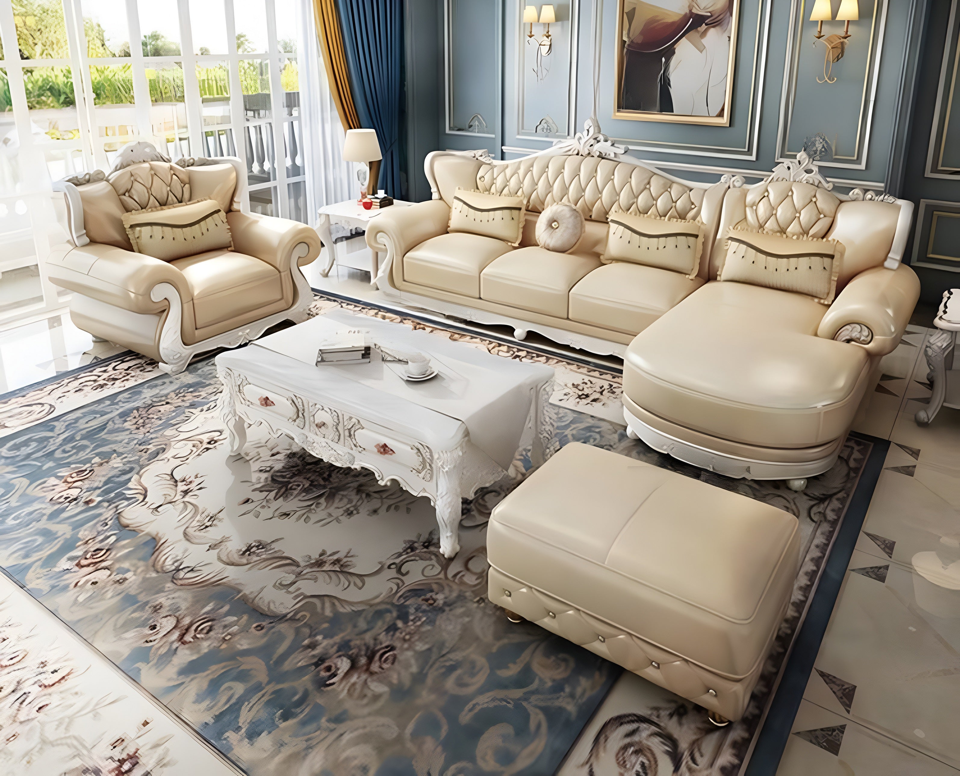 The living room is the ideal setting for this European L-shaped Liville Leather Sofa Set with Chaise with a regal aspect. Due to its distinctive and classic architecture, it will be the main draw for any travelers. With the quality leather covers and durable, long-lasting wood frame in this L-shaped royal sofa set.