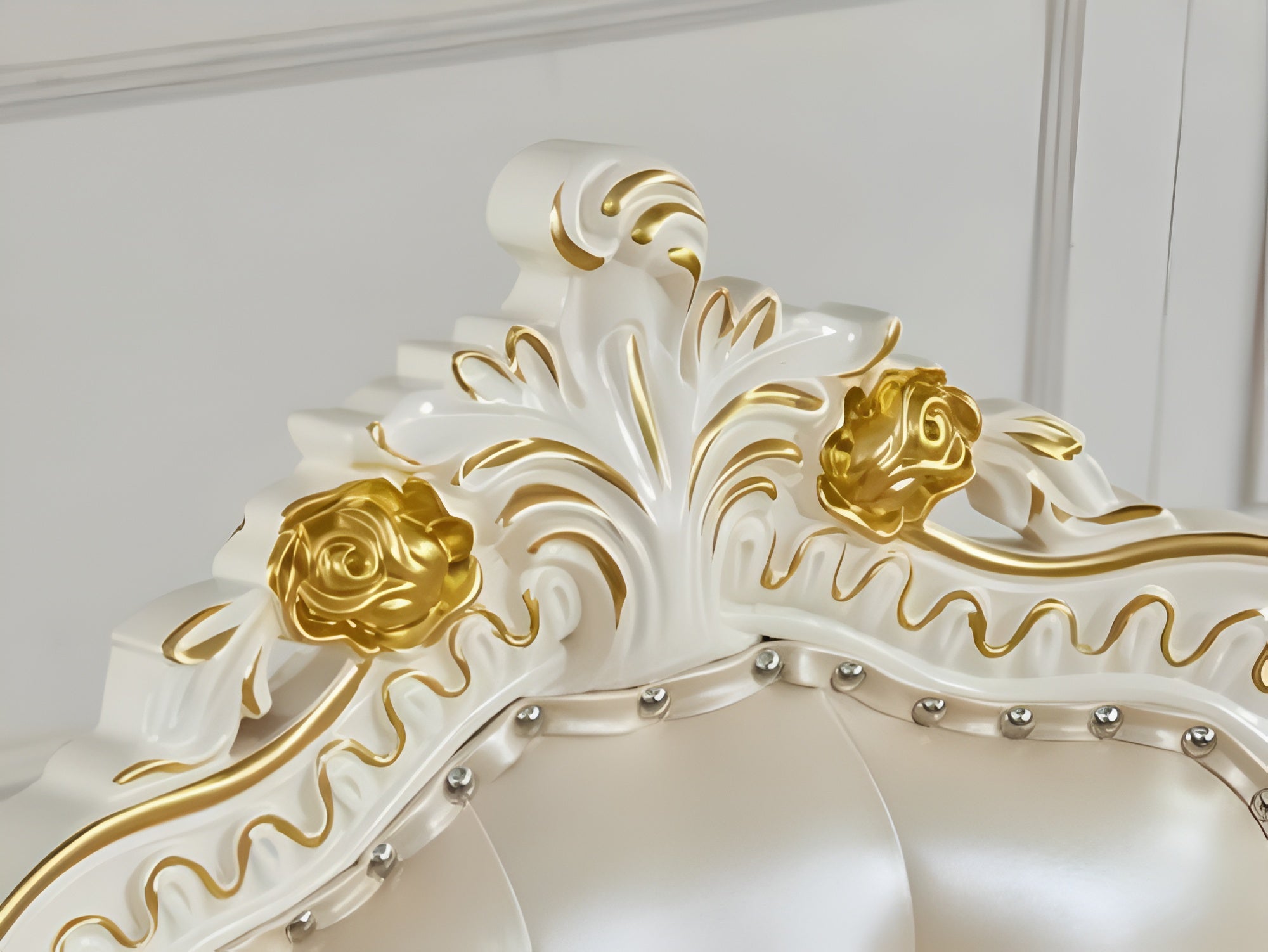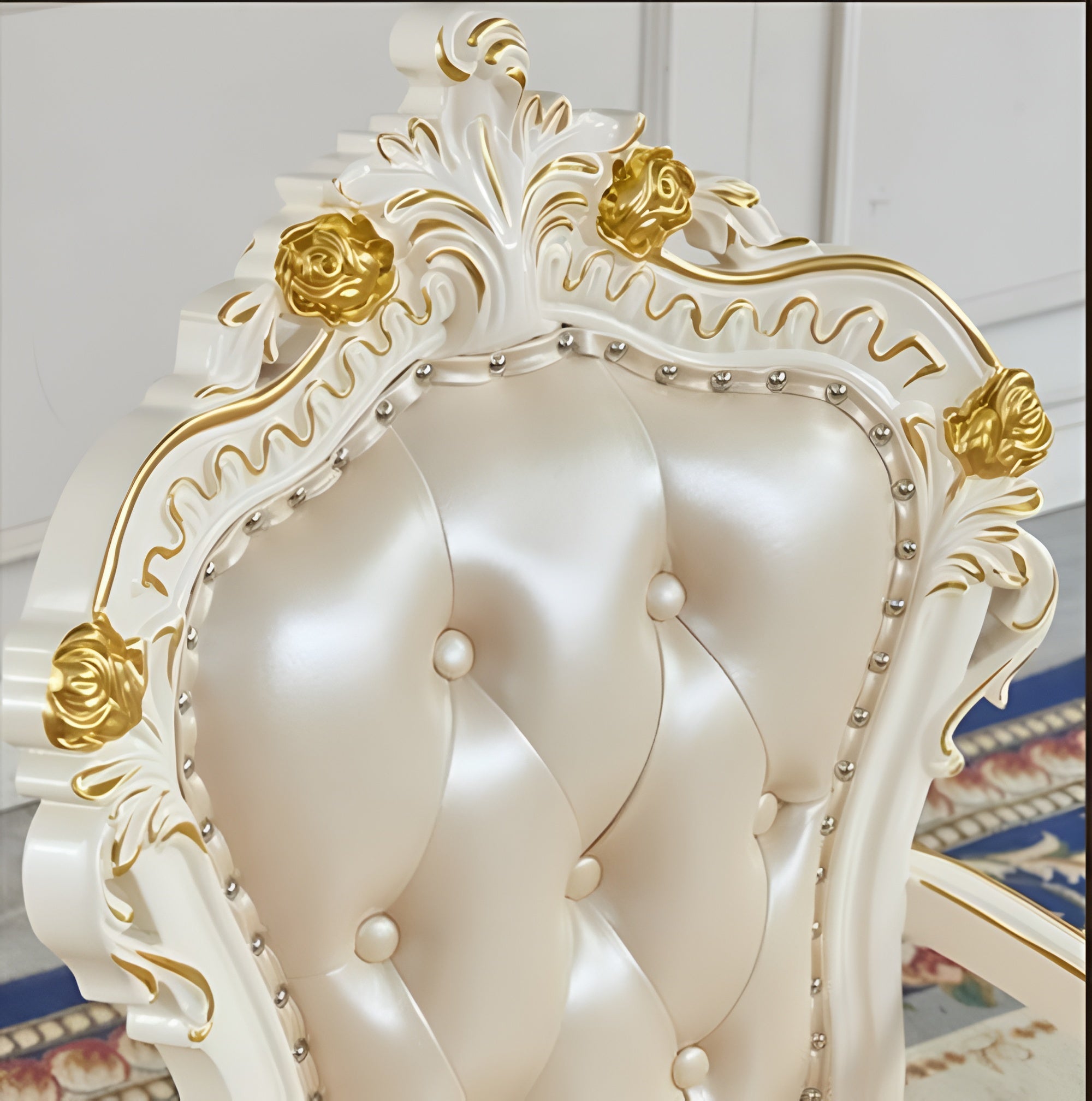 As a result, each Leather Dining Chair has a tufted back and a generously padded seat that are both filled with cozy medium density foam. Furthermore, a classic, luxurious aesthetic is flawlessly captured by the armchair design with its exquisitely carved white and gold accents. In the end, this European Leather Dining Chairs Set of 4 provides outstanding comfort in addition to gorgeous style.