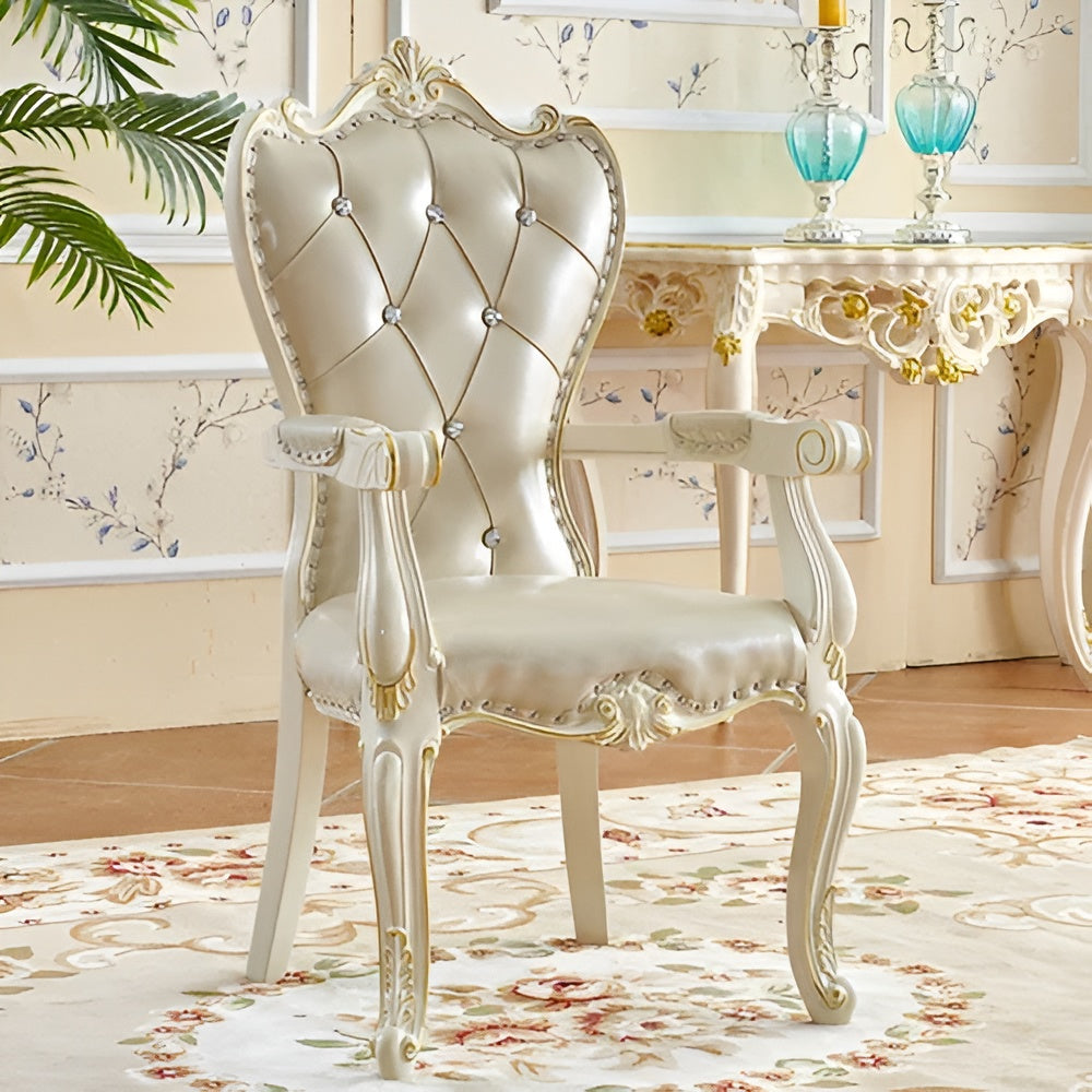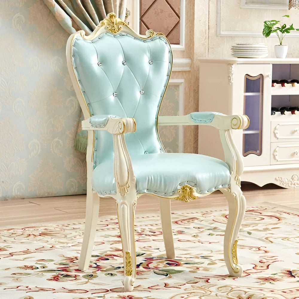 The European Velvet Fabric Dining Chair Set of 4 is made up of solid wood and leather upholstery. The design of the Velvet Dining Chair has glossy features. The floral decorations and tufted button design add an artistic touch and elevates its aesthetic craft skill. The filling offers comfort to the chair and makes it perfect for long meals and gatherings. This Classic European Velvet Dining Chair Set of 4 not only enhances the beauty of your dining room but also contributes to a warm and inviting atmosphere, making every dining experience more enjoyable.