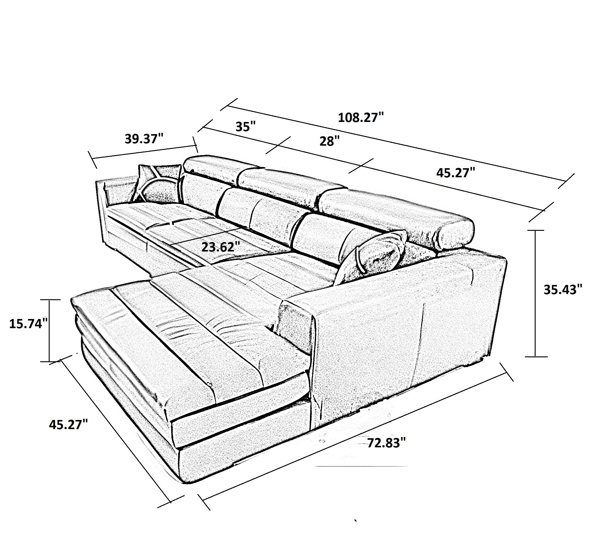 • L108.27xW39.37xH35.43 Inches (275x90x100 cm)