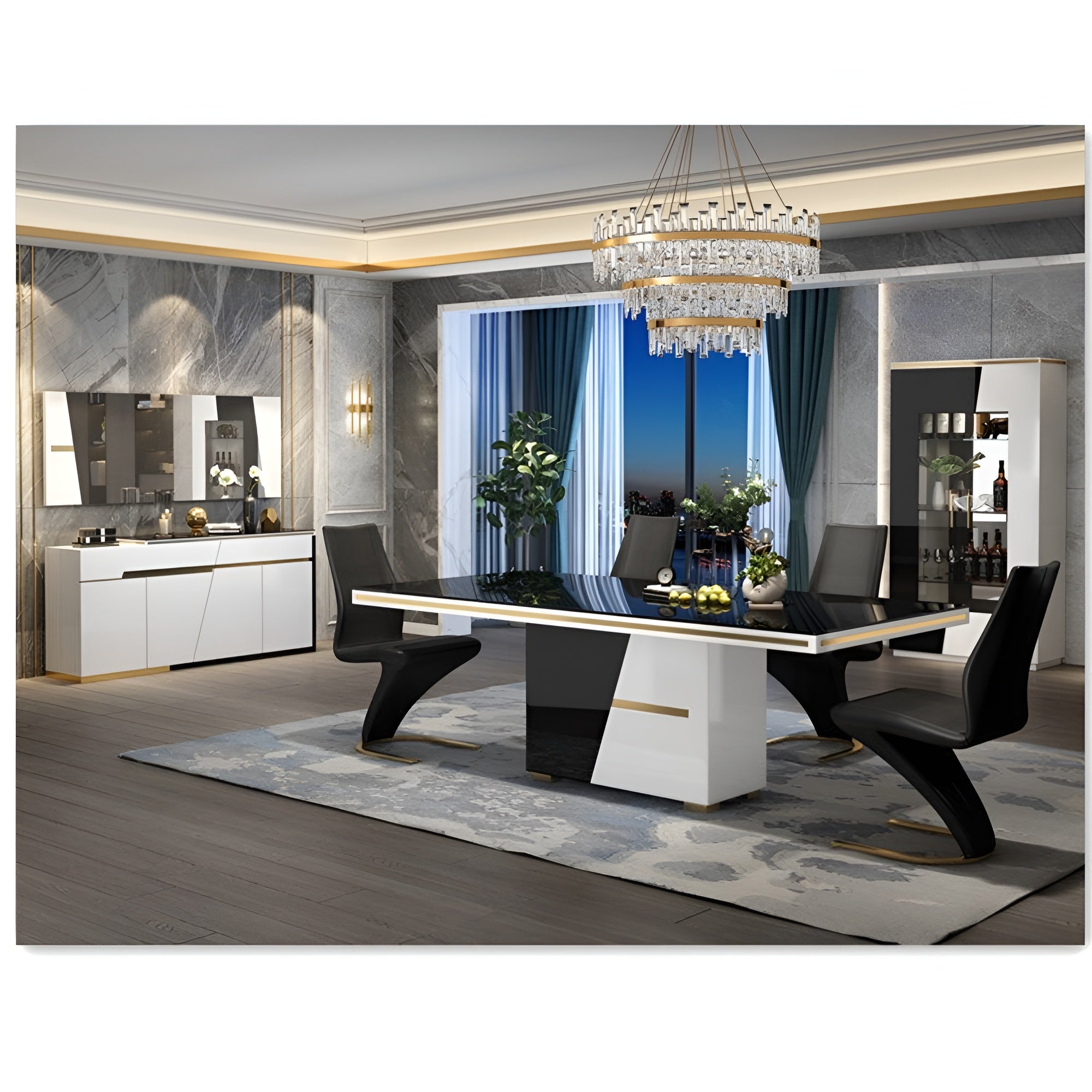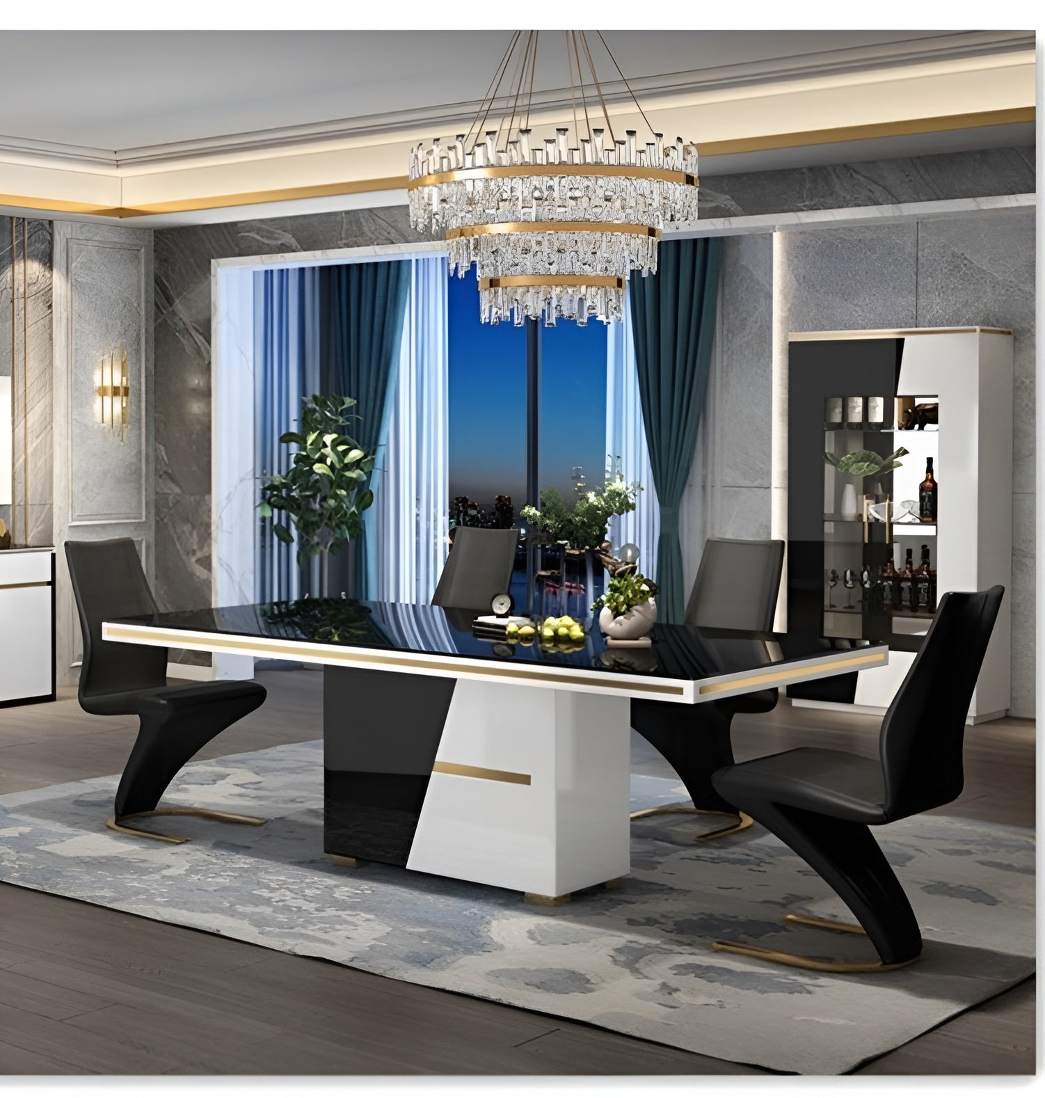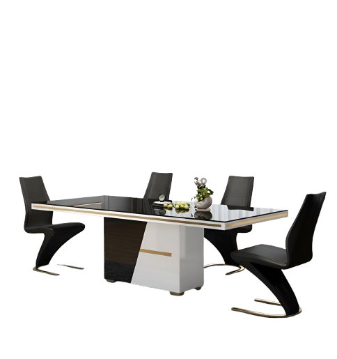 Experience luxury with this striking Glossy Glass-Top Exquisite Dining Table Set. Firstly, the sleek, Modern appearance elevates any dining space. The clear, high-gloss glass tabletop of this glass top dining table rests beautifully on a sturdy solid wooden structure. Furthermore, the unique, black and white base features accenting gold-tone bands and a strong metal leg base for exceptional support.