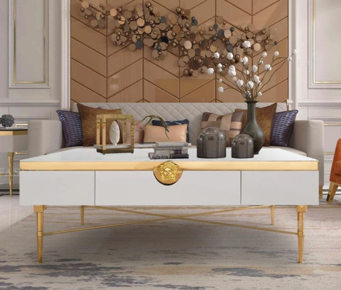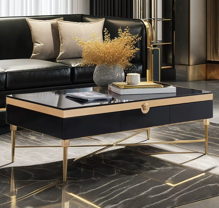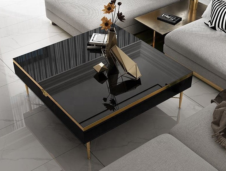 This Glossy Wooden Construct Coffee Table will effortlessly meld with everything from traditional to modern decor. This Coffee Table Top with its gold base caught our eye with its unusual shape and brushed metallic finish. With their unusual steel base, they are perfect for any modern or contemporary home. "Elevate your space with a sleek, glossy Wooden Coffee Table.