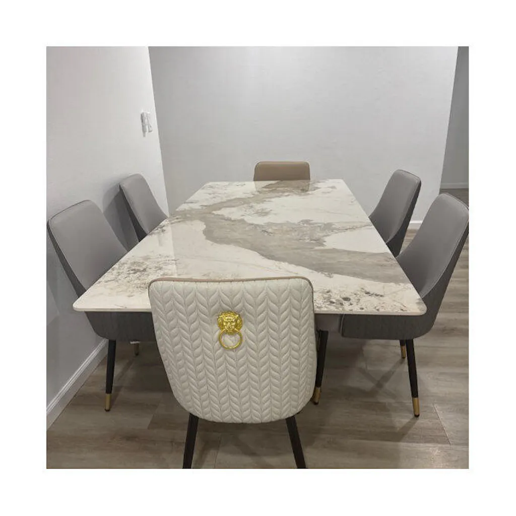 With this Italian Glossy Luxury Dining Table, you can add elegance to your house. This Glossy Dining Table features a high-quality marble tabletop that provides a glossy, smooth surface, making it both aesthetically pleasing and easy to clean. Long-lasting stability and contemporary style are guaranteed by the sturdy metal framework and stylish metal legs.