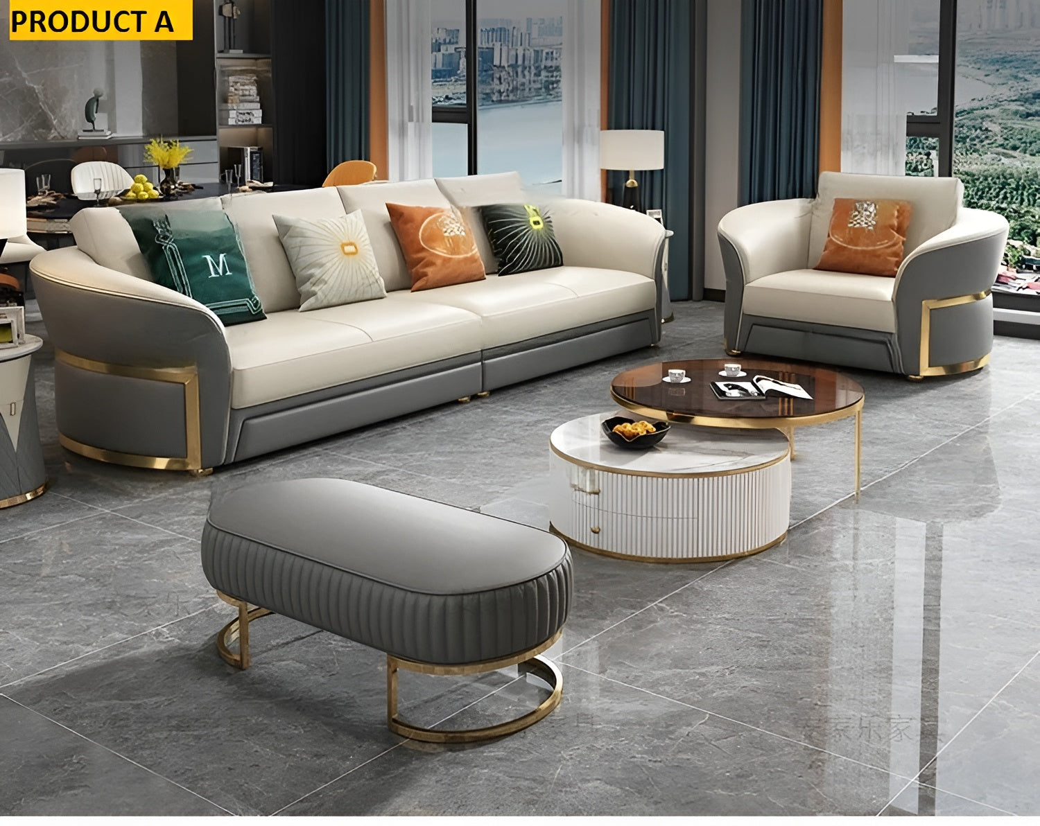 The leather sofa features elegant golden-tone metal frames on the sides, perfectly complemented by the ottoman’s matching golden metal legs. Whether you’re relaxing alone or entertaining guests, this Leather Upholstery Luxurious Sofas With Ottoman combines comfort, functionality, and refined style—making it a stunning focal point for your home.