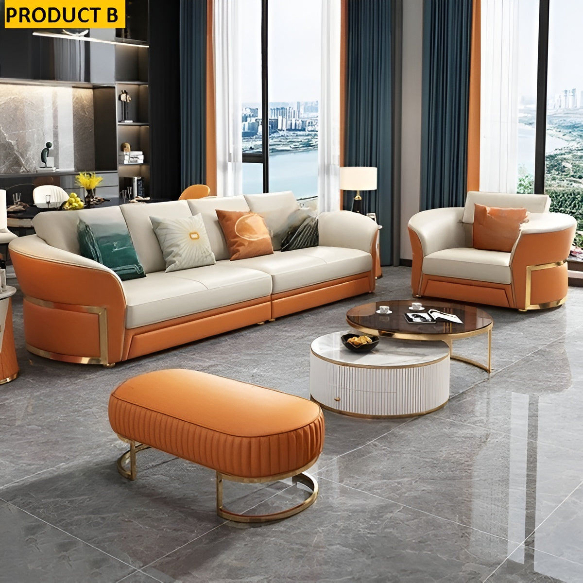 This Leather Upholstery Luxurious Sofas With Ottoman includes a three-seater sofa, a single-seater, and a stylish ottoman, all upholstered in leather for maximum comfort. The distinctive dual-color design adds a modern touch, transforming this luxurious sofa into a centerpiece for any living room.