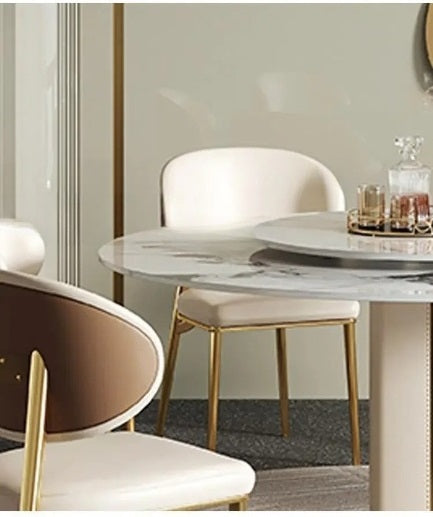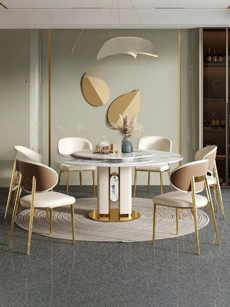 A Luxotic Modern Marble-Top Round Dining Table is a stylish and elegant piece of furniture designed for contemporary homes. It features a smooth, durable marble top that gives the table a luxurious look and feel. The Metal base makes the table sturdy and hard. The round shape makes it perfect for gatherings, offering a more intimate and spacious seating arrangement. The table is usually supported by a sleek, modern base, often made of metal or wood, to complement the marble top. This luxotic modern marble-top round dining table adds a touch of sophistication to any dining room, combining beauty and functionality in one piece.