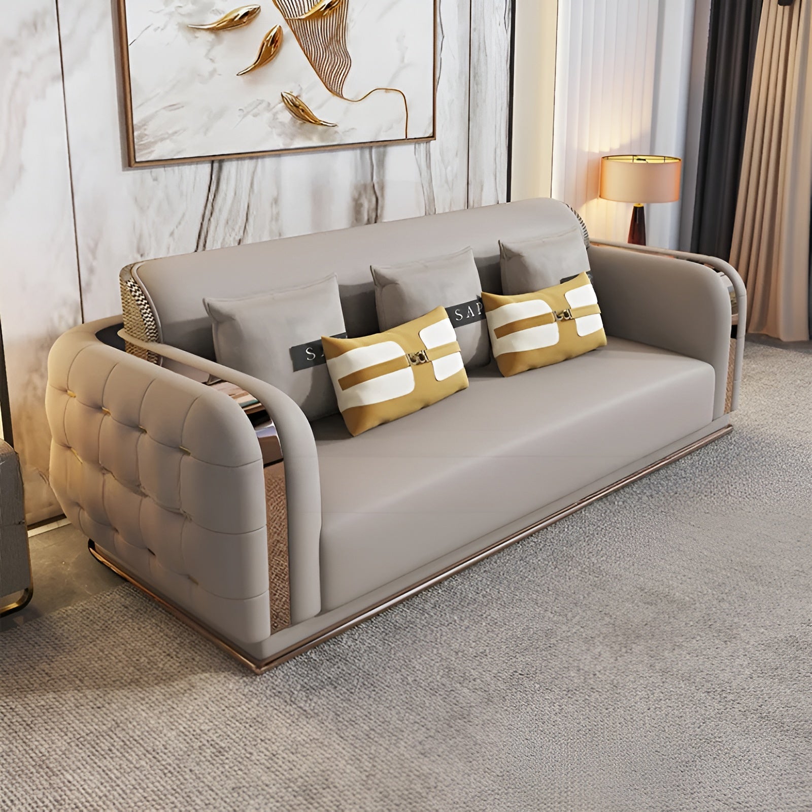 This Luxury Fusion of Tufted Design 3-2-1 Leather Sofa Set includes a three-seater, two-seater, and single-seater sofa, all upholstered in fine leather. The solid wood structure is elegantly supported by golden-tone metal frames and bases. Each piece features a button-tufted design on the back and sides, adding a classy touch to its modern appeal.