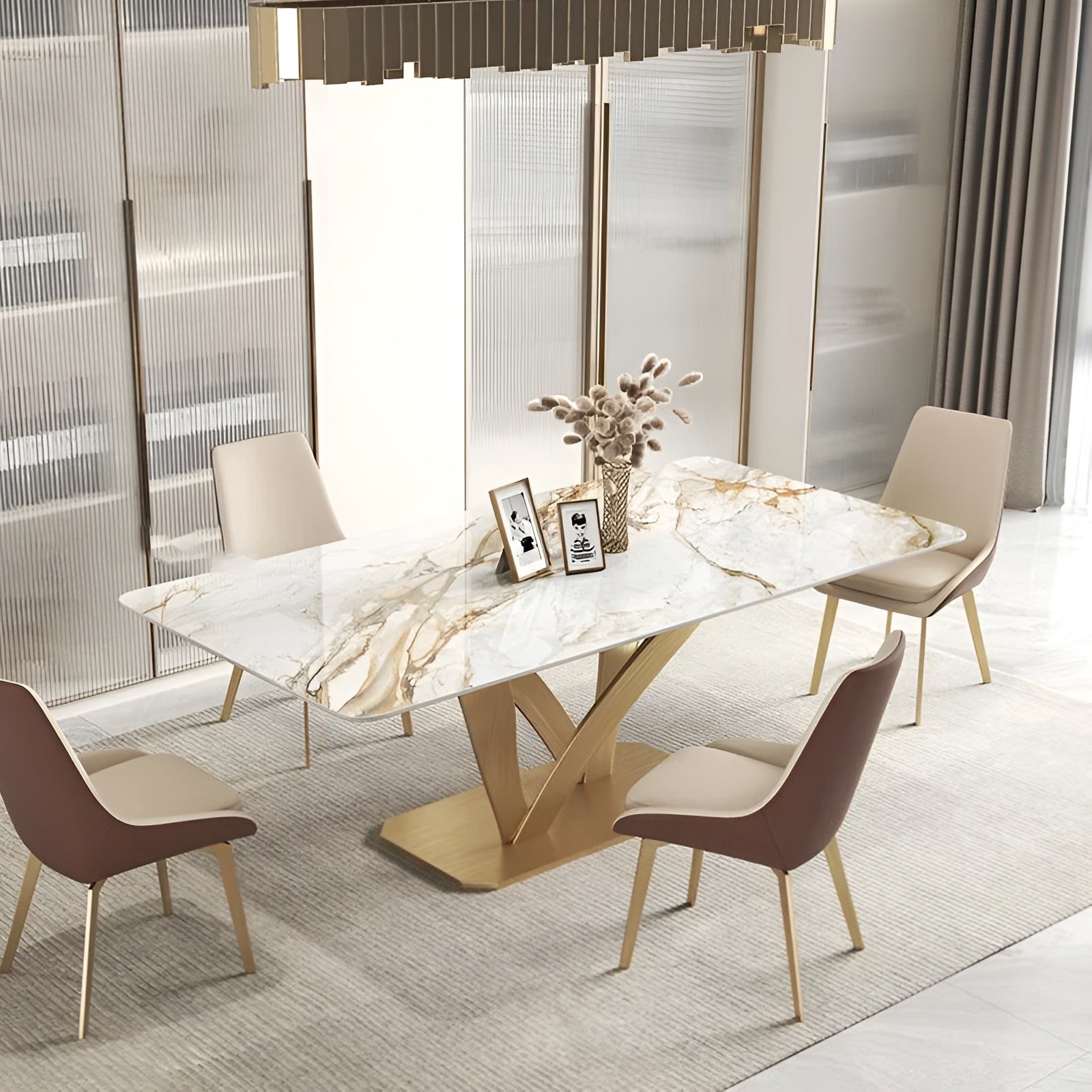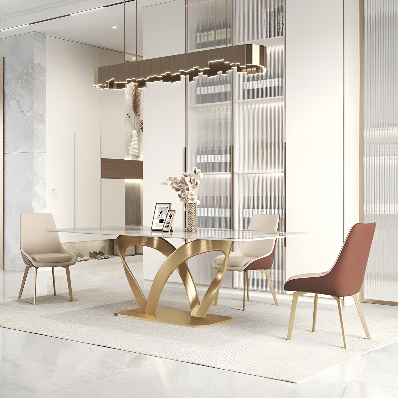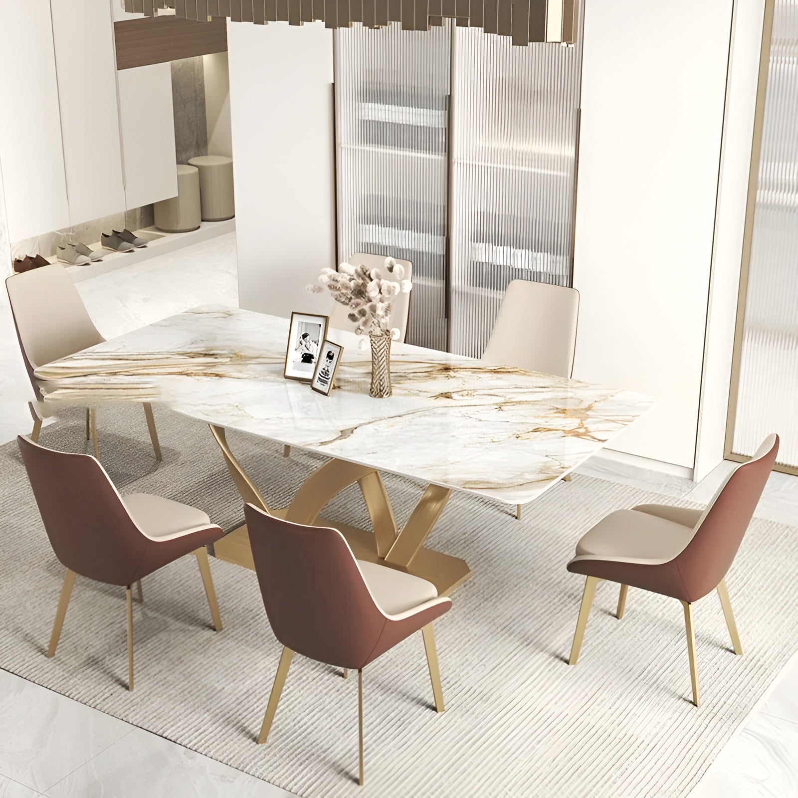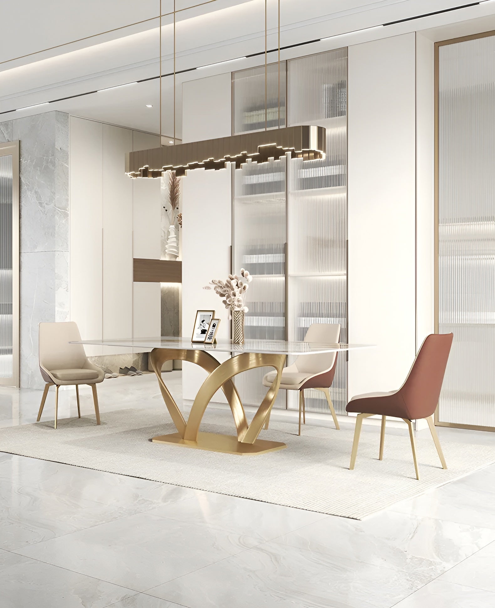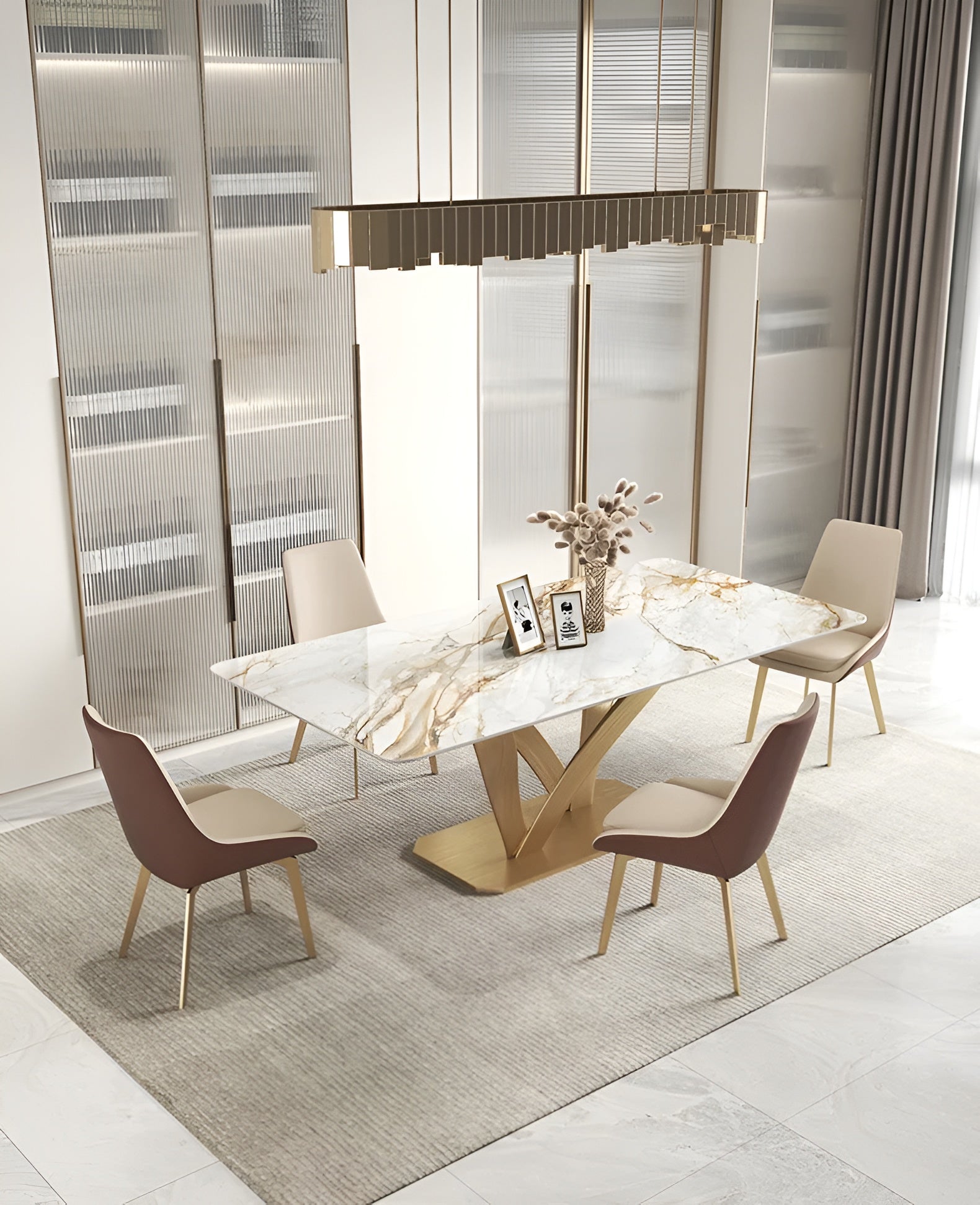 For you, the Marble Dining Table set with Gold Accents is ideal. This Dining Table Set blends classic elegance with contemporary design. The sleek metal base and structure of the dining table add a touch of sophistication, while the marble top has a lovely, distinctive pattern. Additionally, the golden finish of the table perfectly matches the legs of the chairs.