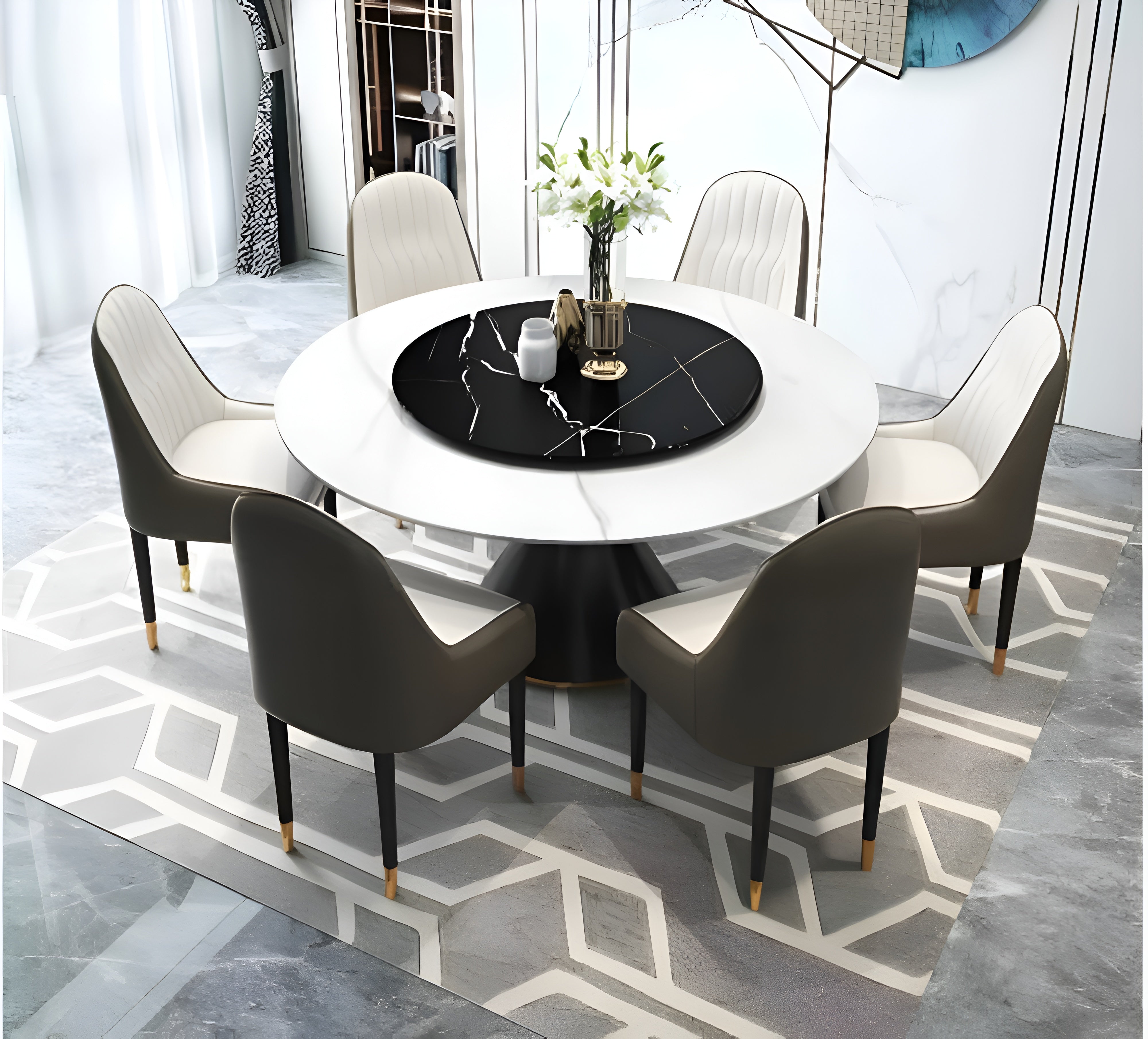 The cozy leather chairs add an extra charm to the round dining table with their attractive look and great sturdy body structure. Every meal is a smooth and delightful experience for family and guests thanks to the Marble Top Round Dining Table Set with lazy susan, which combines style and convenience.