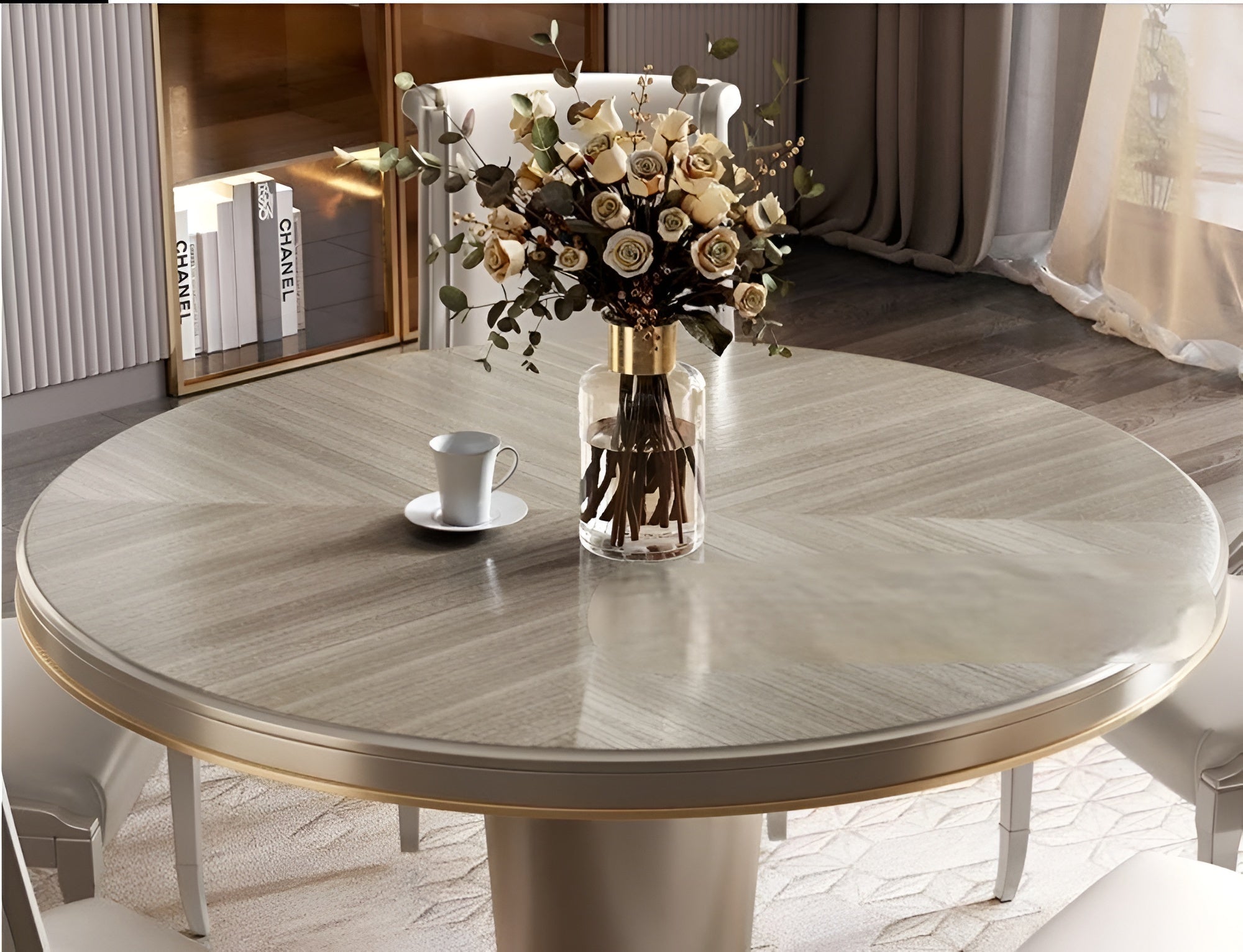 Expertly crafted, this round dining table is exceptional, tasteful, and built to last. The strong leather-upholstered chairs complement the exquisitely designed table and create a lasting impression. Perfect for those looking to refresh their interiors, this matte round wooden dining table set adds timeless elegance and unmatched style to your living space.