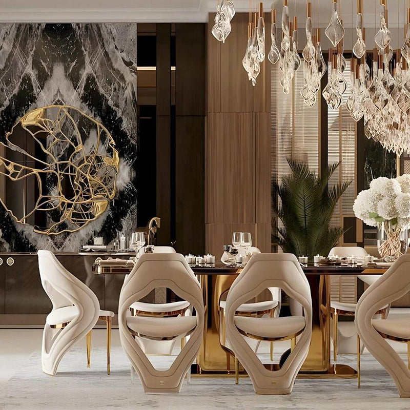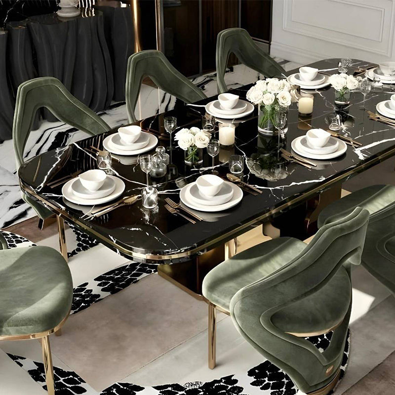 I'm blown away by my new Dining Table Set! The high-quality marble surface on the dining table is stunning, and it's perfectly supported by a strong, full-metal frame and a visually appealing metallic base – it's both stable and stylish. The option to upgrade the eight dining chairs to velvet upholstery for a more luxurious look is awesome – it adds an extra touch of sophistication and comfort. I'm loving the way this set elevates my dining experience – it's a fantastic combination of luxury, style, and functionality!