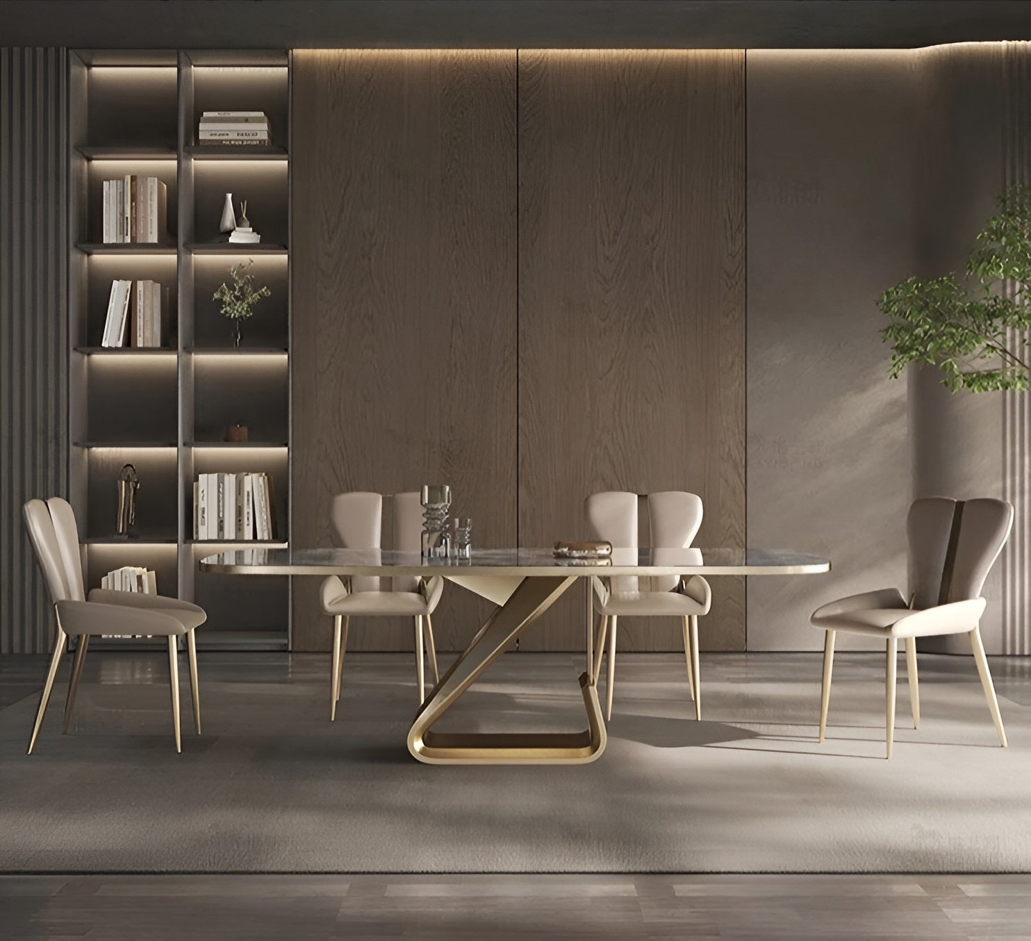The Metal Base Marble-Infused Dining Table Set is the ideal fusion of contemporary style and elegance to enhance your dining experience. This Dining Table Set gives a touch of luxury to any space with its gorgeous marble table top. Sturdiness and style are provided by the table's sculptural metal base and structure. For a plush appearance, the chairs can be customized with velvet upholstery instead of the soft imitation leather.