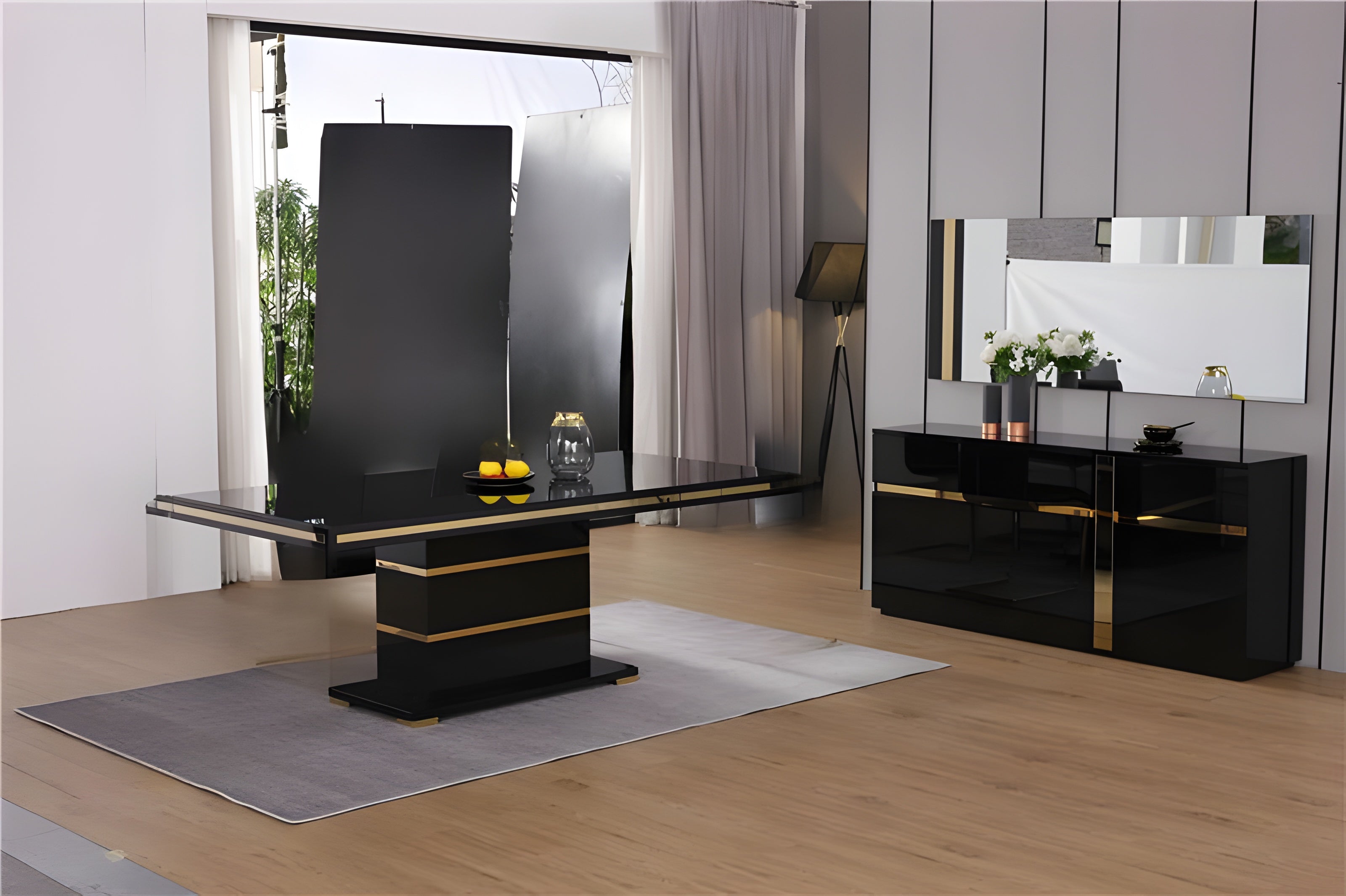 This Modern Dining Table is the ideal option for both special occasions and daily meals because of the sturdy wood base, which enhances the overall elegance. Additionally, the gold embellishments and high-gloss black finish add a modern touch. This Modern Black Wooden Dining Table seamlessly combines design and functionality, whether you're hosting or enjoying a quiet meal.
