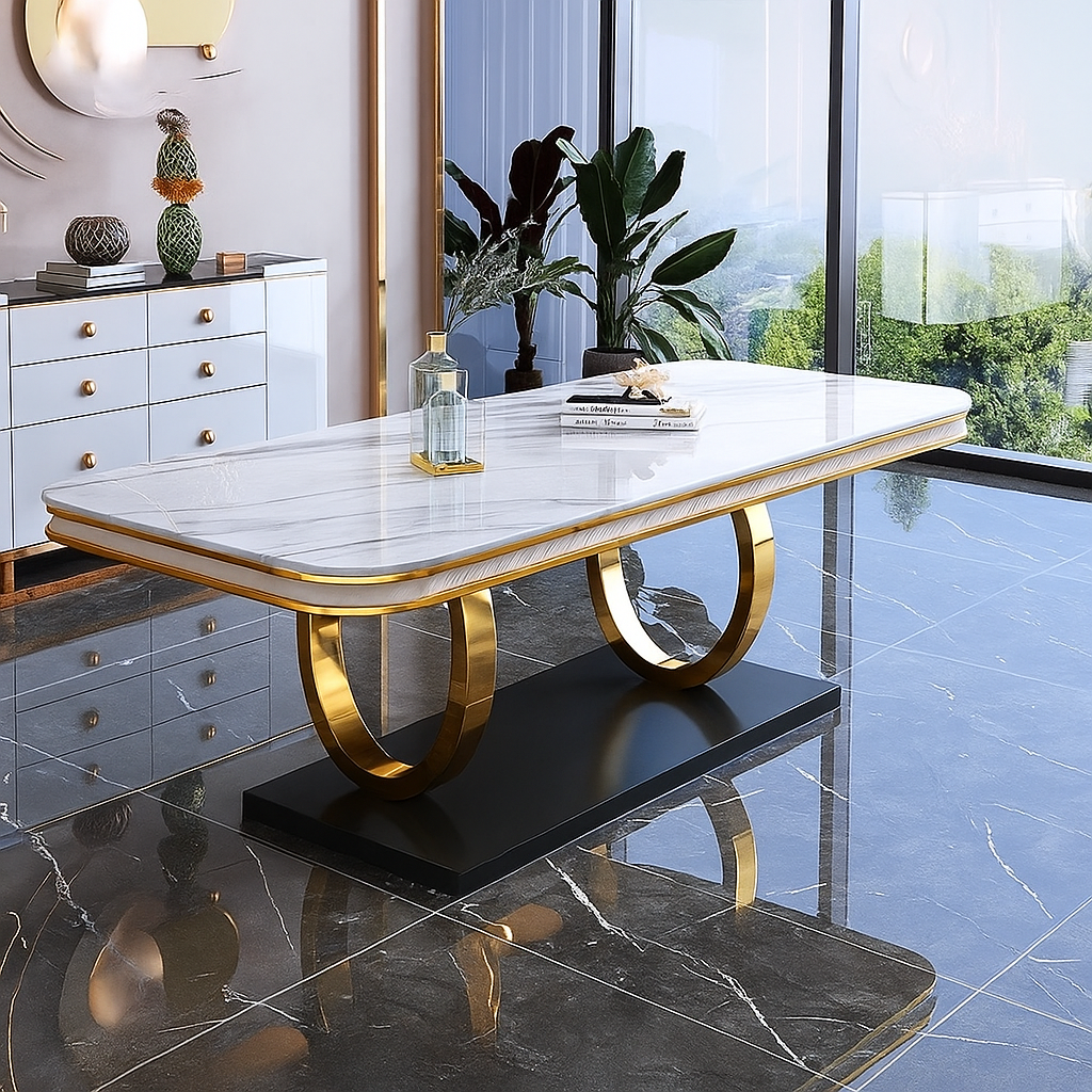 These Modern Dining Tables go perfectly well in home interior setups with elegant decor and add a level of sophistication to any dining space. Crafted from carbon and stainless steel, its sturdy frame is adorned with a glossy golden finish. This Modern Creative Marble-Top Dining Table is sure to become a show-stopper in the dining room.