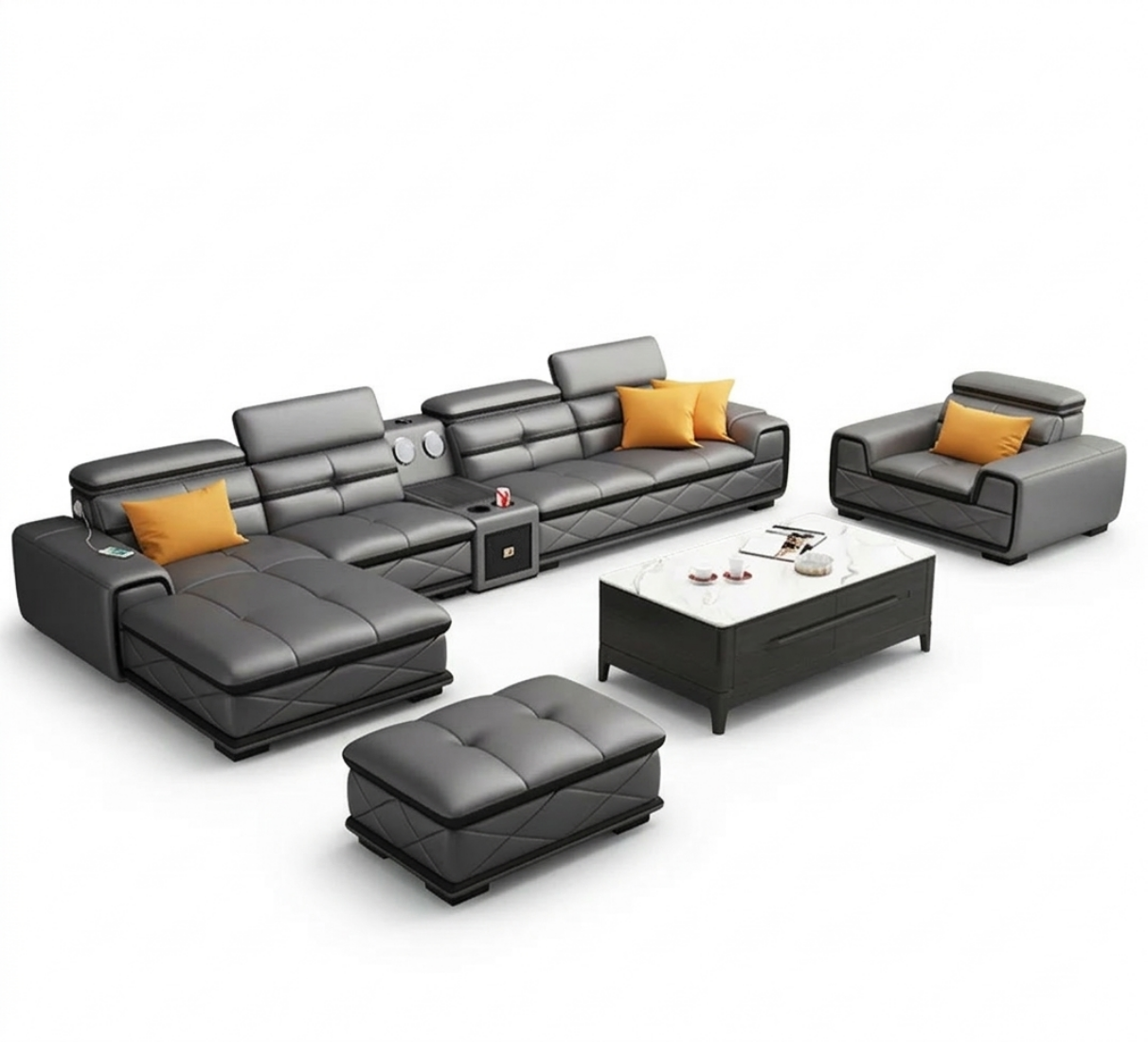 Our Modern Leather Sectional Sofa Set offer modern  convenience and luxury relaxation. Thick armrests provide unrivaled comfort. A sturdy storage armrest allows you to keep all your essentials close by. Take your smart home technology to the next level with our dual stereo speakers. Our leather sectional sofa includes a smart USB charging button as well as storage drawers for organizing and charging your gadgets.