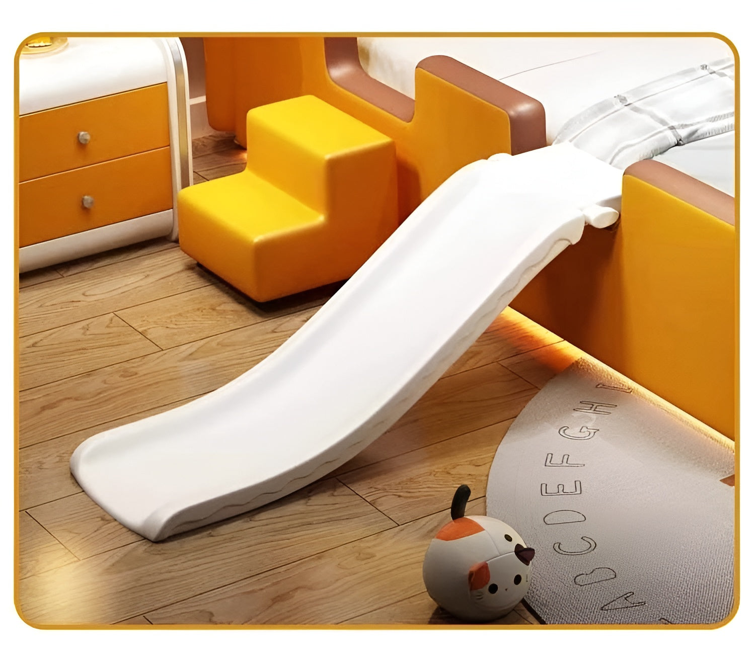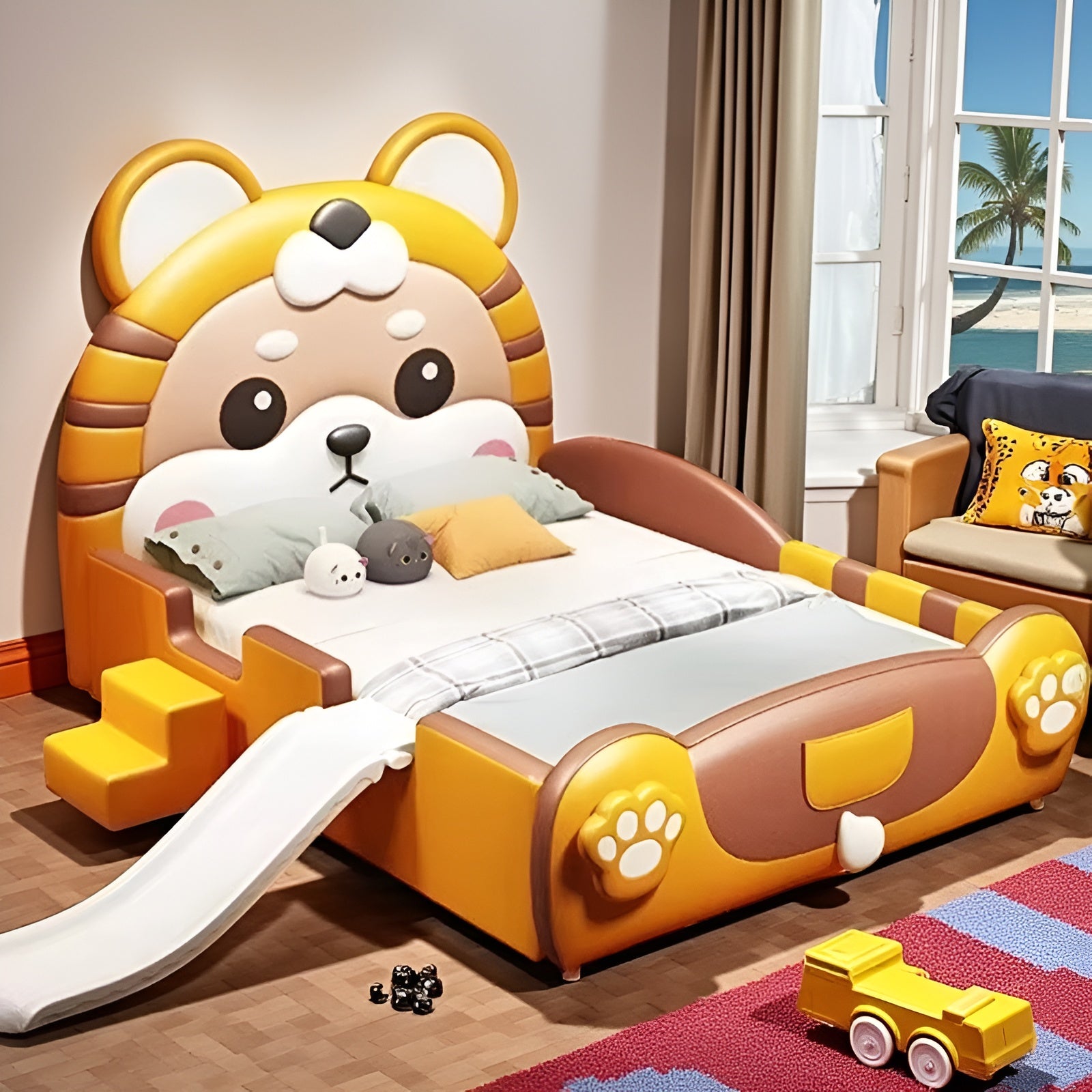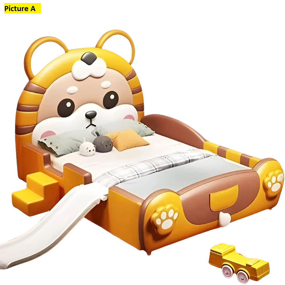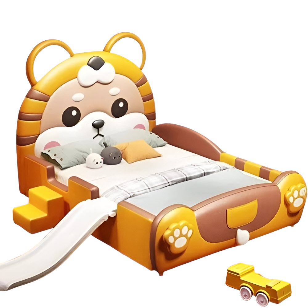 One of the most appealing features of this bed is the addition of a fun slide and ladder. Because safety is a key priority, this bed features an elevated safety guardrail. The metal feet provide structural strength. Overall, this modern leather teddy design kid's bed provides a nice haven for children to sleep and play.