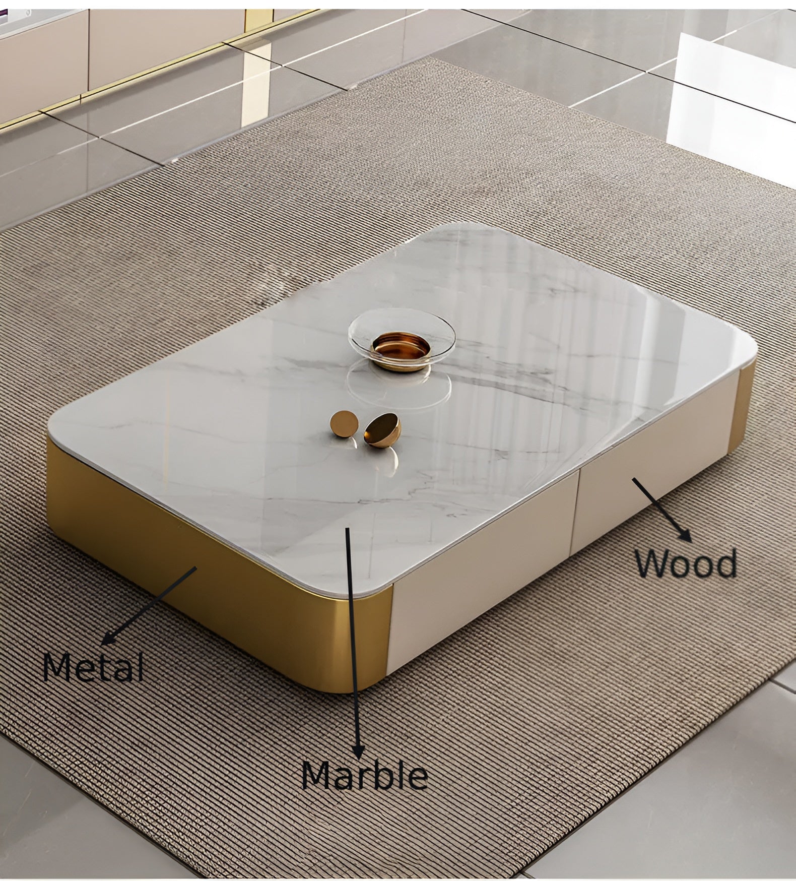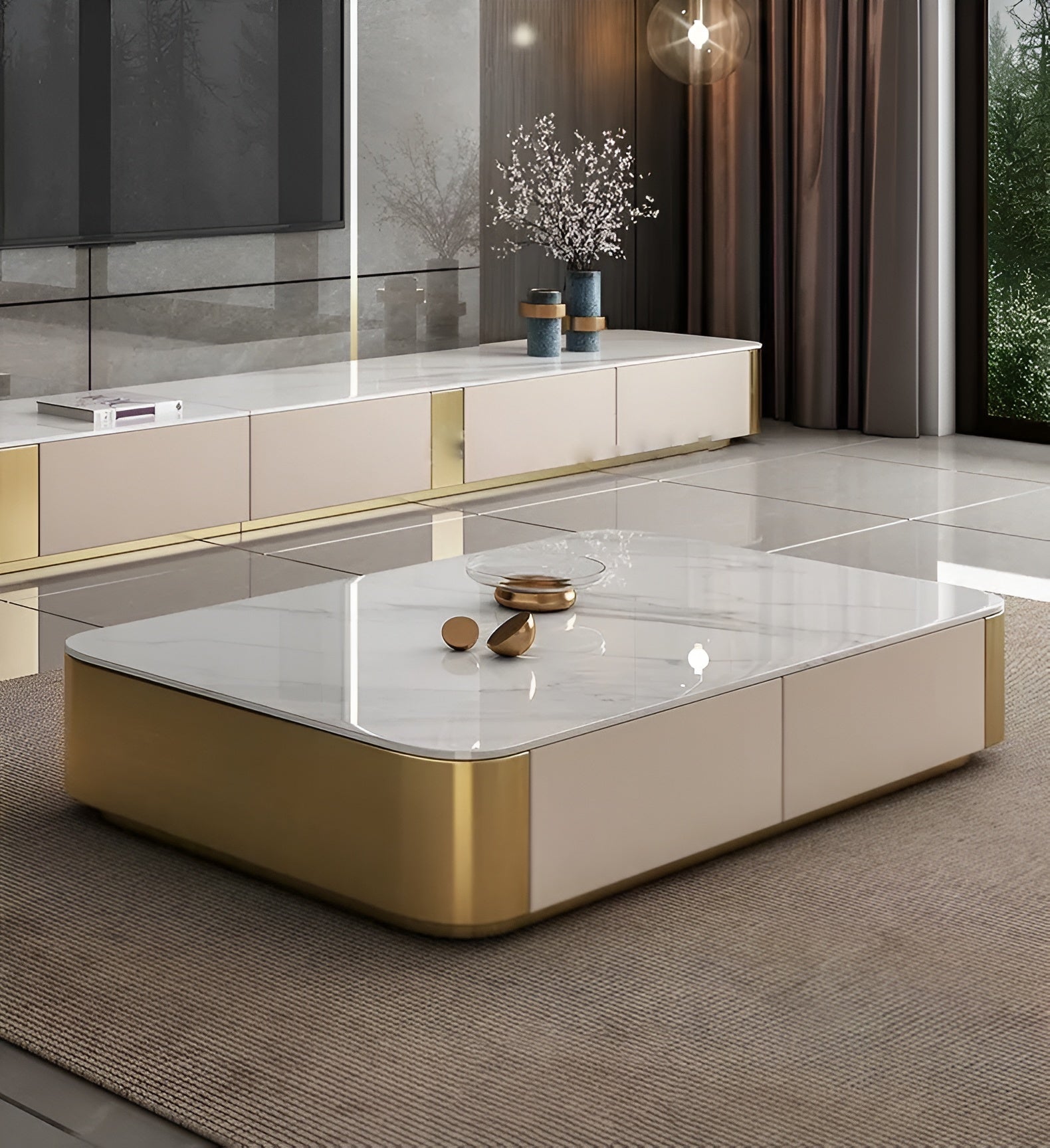 The Modern Luxurious Design Wooden Marble-Top TV Stand & Coffee Table epitomizes refined luxury in home decor, seamlessly blending design and functionality to create a harmonious aesthetic. Constructed from wood panels, it embodies the Italian design philosophy that prioritizes both style and safety. The robust baked varnish finish and precise weighting contribute to the structure's stability and load-bearing capacity.
