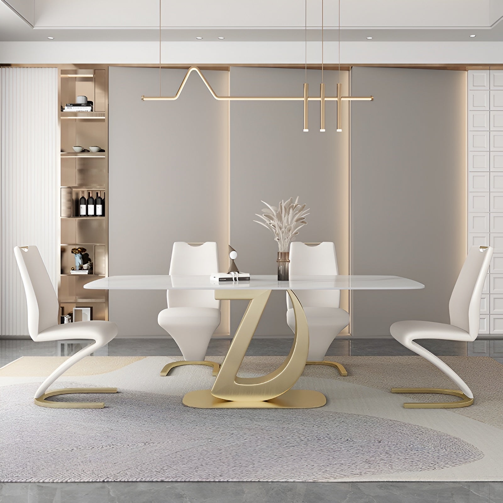This Modern Marble Dining Table Set With Chairs will enhance your dining experience. The large Marble Dining Table Set is supported by a striking metal base that has been finished in gold, making it the focal point of any room. Additionally, the sophisticated metal dining chairs offer stability and style thanks to their distinctive Z-shaped design.