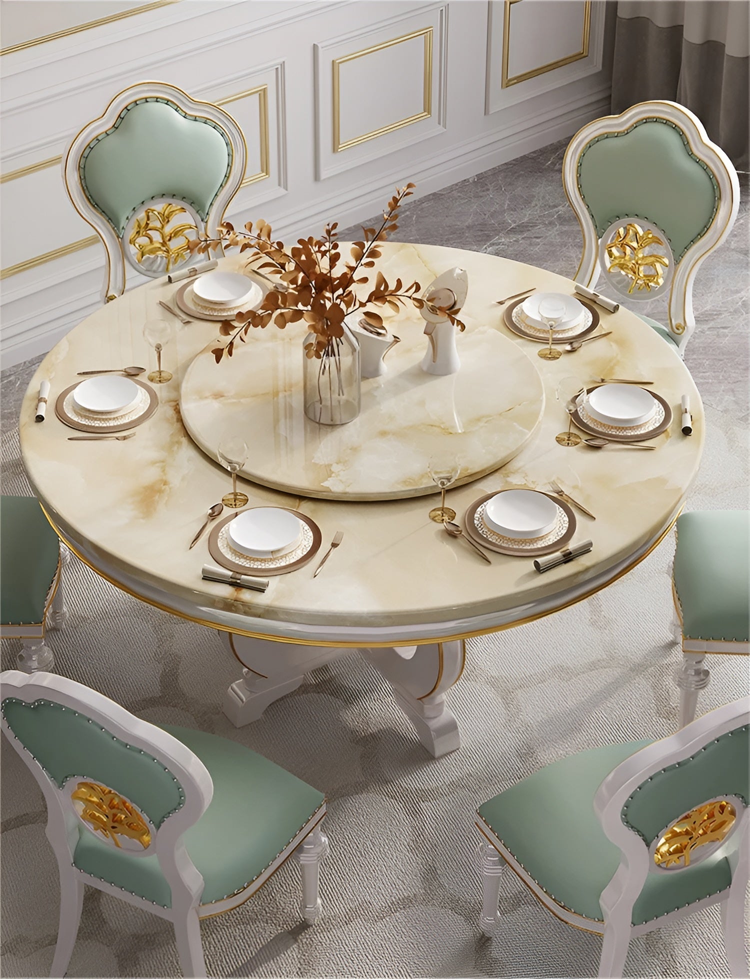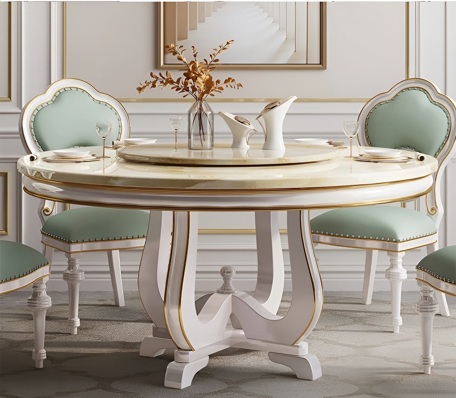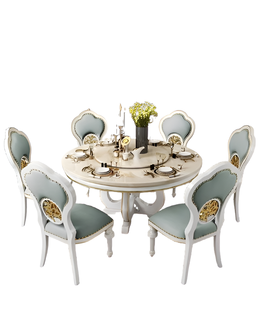 A Modern Marble Round Dining Table Set is an elegant and stylish furniture set designed for dining spaces. The set includes a round dining table with a smooth, high-quality marble top that adds a touch of luxury to your home. The table is paired with matching chairs made of solid wood and having a n upholstery of leather, which are often designed to complement the sleek, modern look of the table. The modern marble round dining table set is not only beautiful but also durable and easy to clean. The Solid Wooden base makes it more durable and sturdy.