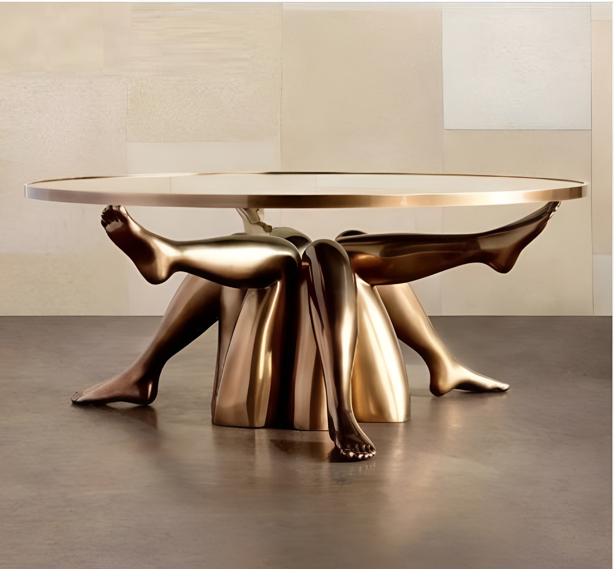 This Modern Round Glass Top Coffee Table will give your room a striking artistic touch. Its smooth tempered glass tabletop, accentuated with a sturdy metal outer ring for extra beauty, is designed to enchant. This Glass Coffee Table is a real statement piece because to its sculptured metal base, which is designed like interwoven human legs.