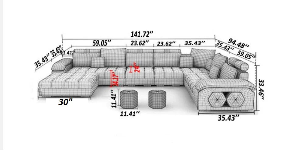• L141.72+94.48xW35.43xH33.46 Inches (360+240x90x85 cm)